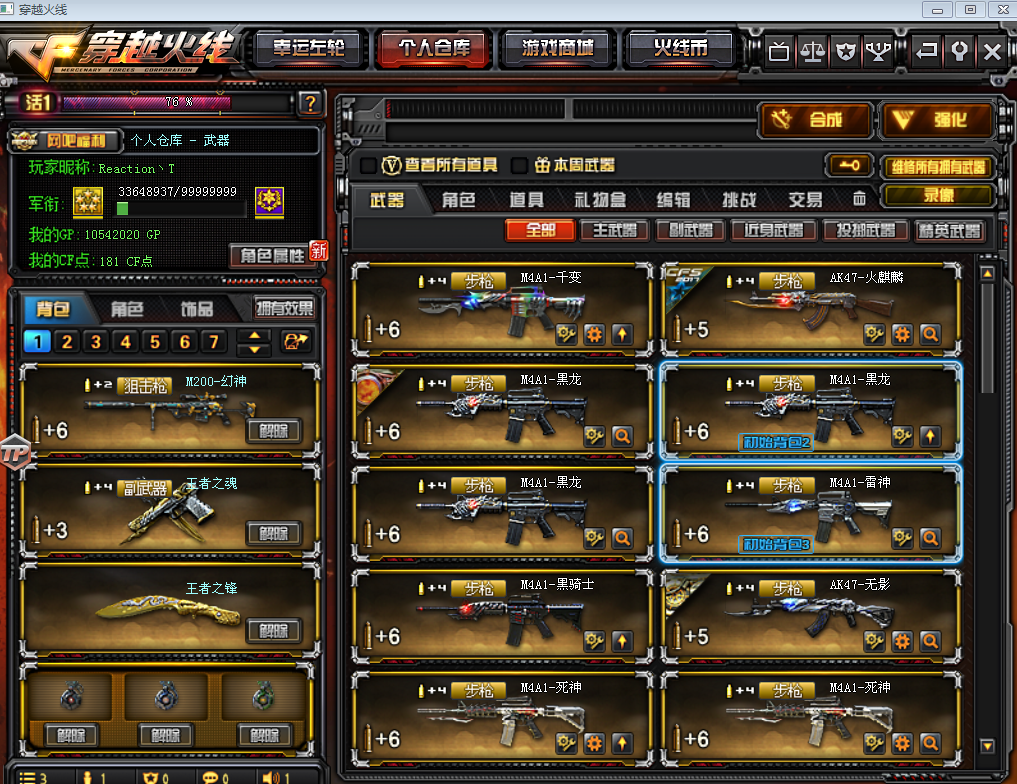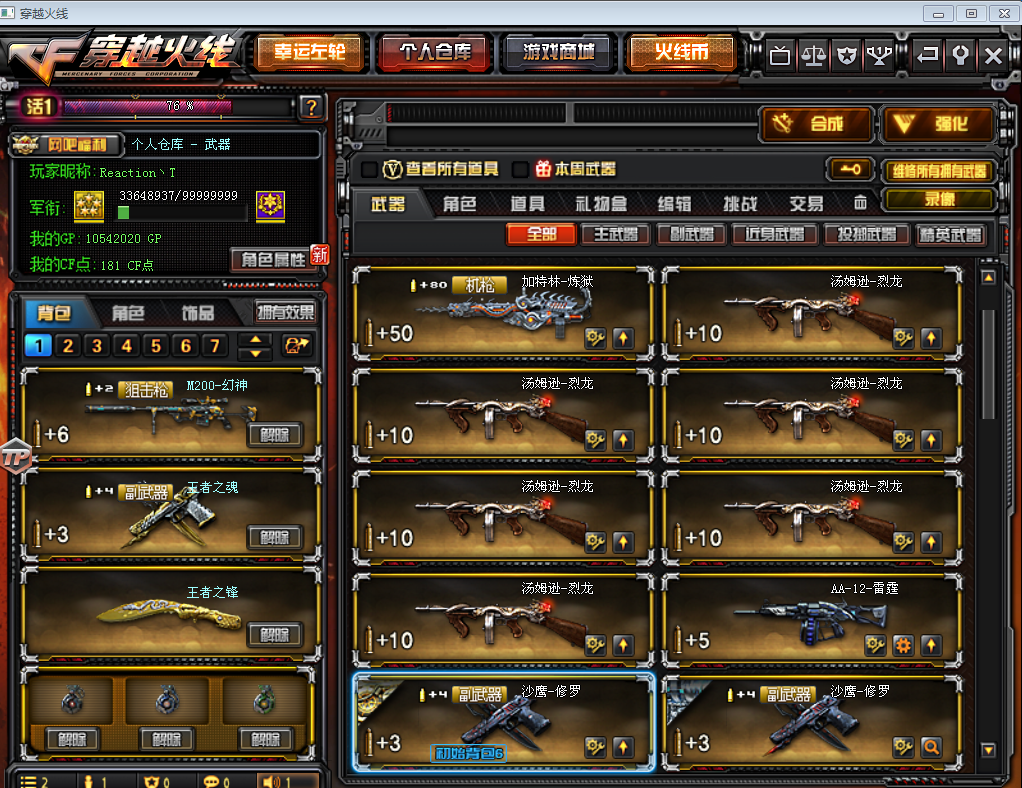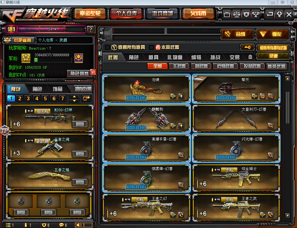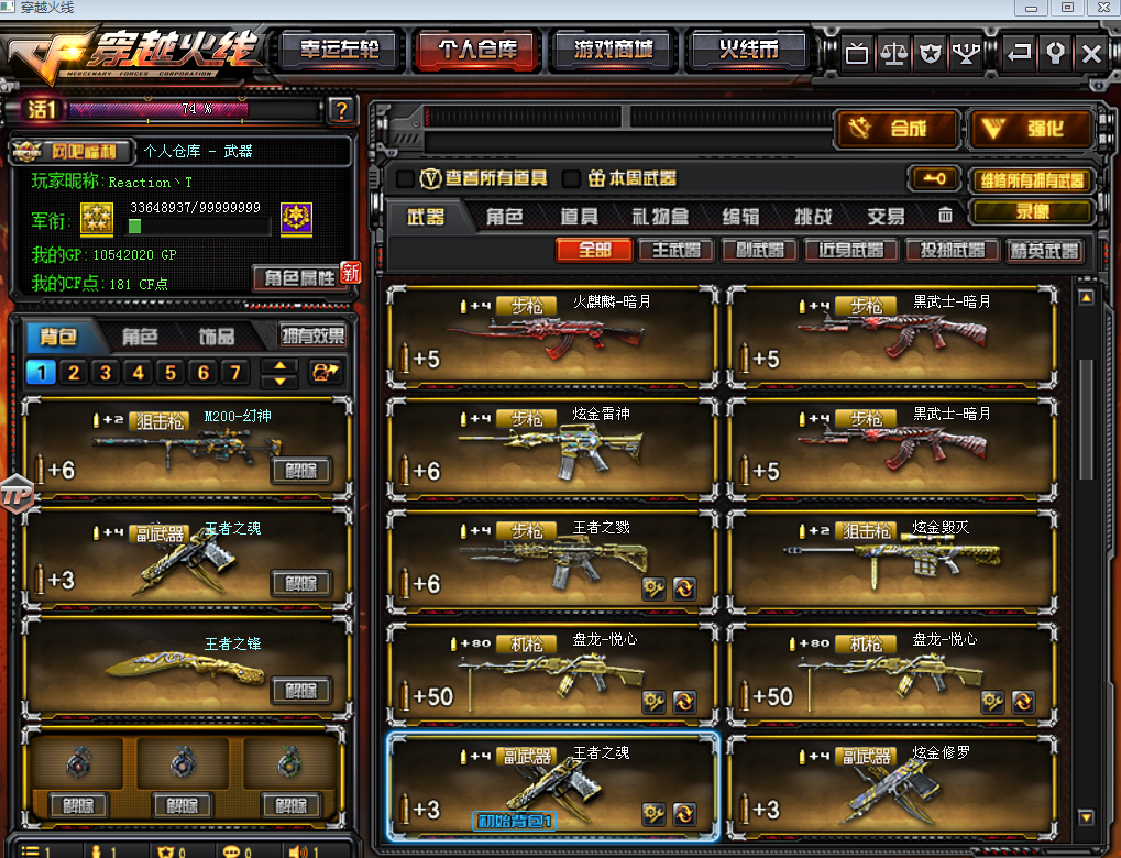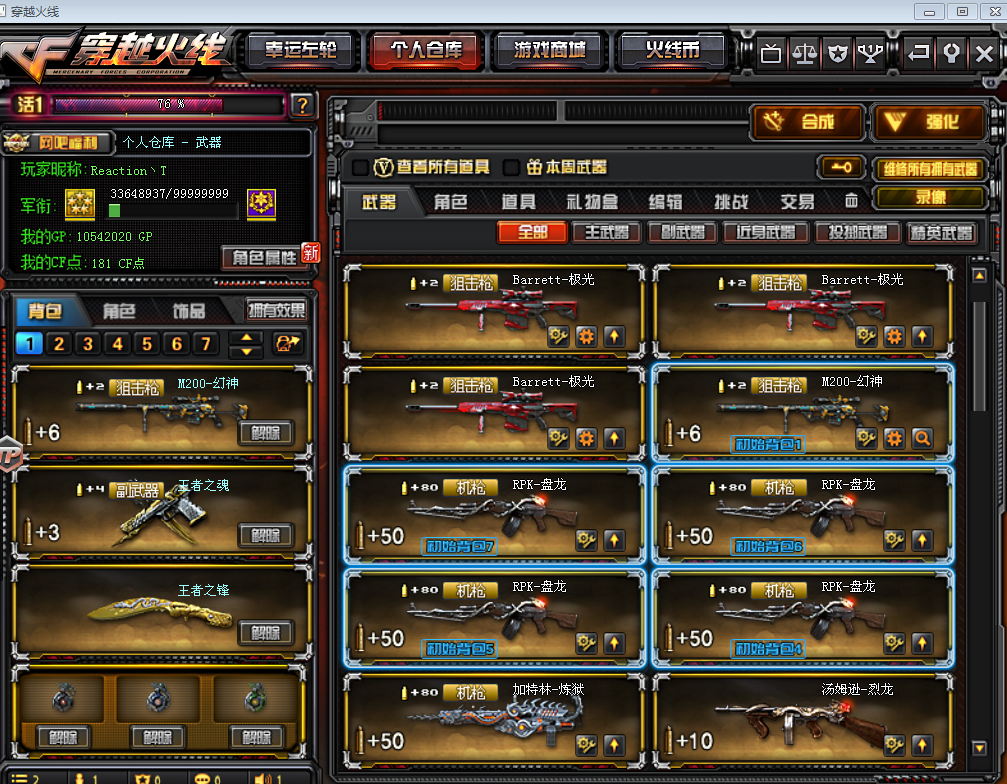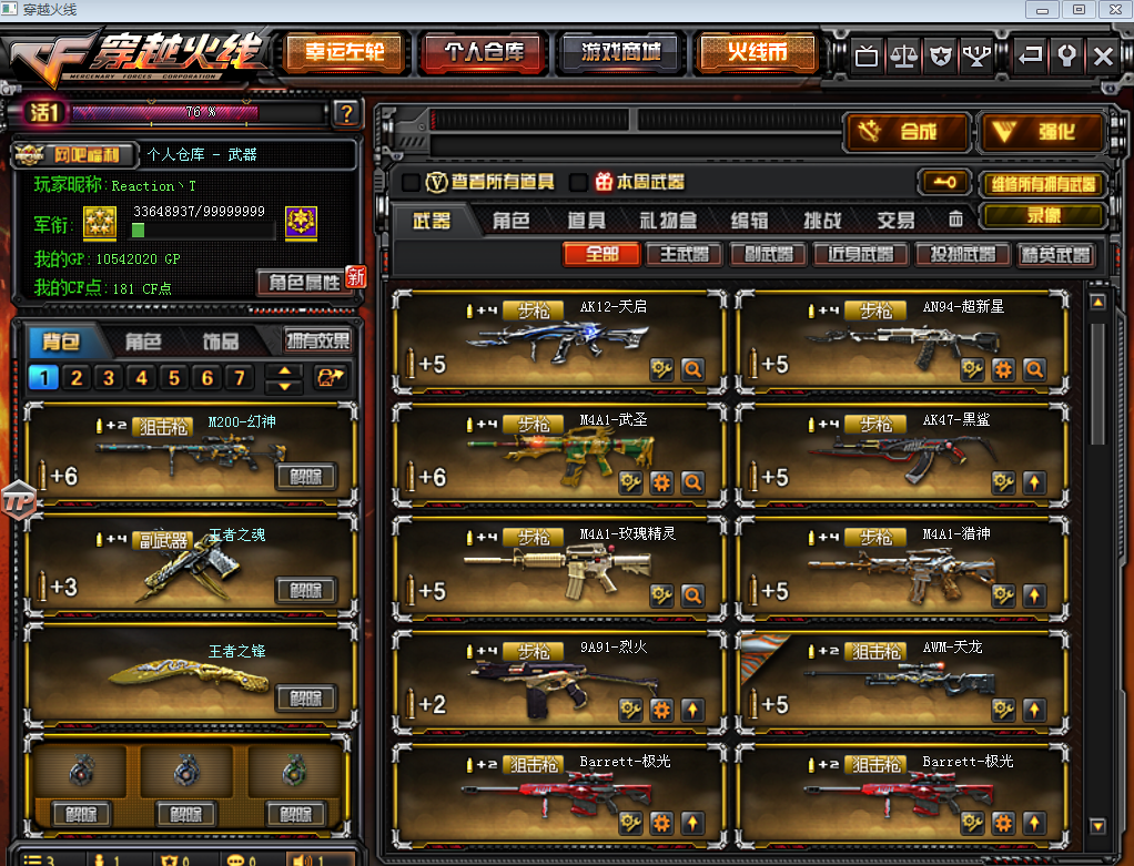 【主 武】:M200幻神、烈龙X6、加特林炼狱、盘龙X4、王者之心(已觉醒)、王者之魄(已觉醒)、王者之幻-已觉醒、王者之戮、王者之武、炫金毁灭、炫金雷神、炫金骑士、火麒麟灵狐、千变、火麒麟(CFSTAR)、黑龙X3(暗月)、雷神(雷神音效卡)、黑骑士、无影(耀金皮肤)、死神X2、黑武士X2、天启、超新星、武圣、黑鲨、玫瑰精灵、猎神、烈火、天龙(秘银)、极光X3、AA12雷霆、黑武士暗月X3、火麒麟暗月X3、天蝎座、处女座、金牛座、苍雷、白羊座、射手座、苍雷、乱世、征服者、死亡之眼、斯泰尔巧克力、激光毁灭者3级