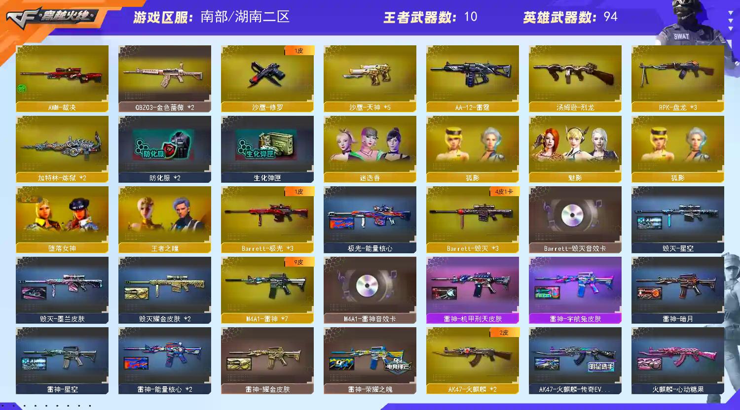 【主 武】:王者之幻(已觉醒)、王者之力、王者之魄、王者之势(已觉醒)、王者之武、王者之影、炫金火麒麟、炫金天龙X2、炫金雷神、炫金骑士、炫金超新星、武圣青龙、千变、火麒麟(传奇EVEN皮肤、CFSTAR、雷神、AG战队皮肤)、黑龙X3(暗月)、雷神X7(雷神音效卡、耀金皮肤、荣耀皮肤、星空、暗月、能量核心皮肤)、黑骑士(音效卡、耀金)、无影、死神X2(秘银)、黑武士、天启、超新星X3、黑鲨、龙血、玫瑰精灵X2、QBZ03金色蔷薇X2、猎神、烈火X2、AK47-猩红传说X7(老兵传说皮肤)、AK47-B-战士、AK47-B-战神(粉色甜心皮肤、流金岁月皮肤、紫媛金章皮肤)、天龙(传奇白鲨、秘银皮肤)、毁灭X3(毁灭音效卡、AGCFPLS15冠军皮肤、耀金皮肤、星空皮肤)、极光X3(能量核心)、裁决、Barrett金色蔷薇、Barrett暗月传说、加特林炼狱X2、盘龙X3、烈龙、AA12雷霆、源雷神、源天启、、天蝎座、金牛座、白羊座、射手座、神罚、乱世、苍雷、斯泰尔恶棍、征服者、死亡之眼、激光毁灭者3级、巴雷特零水下丽影、