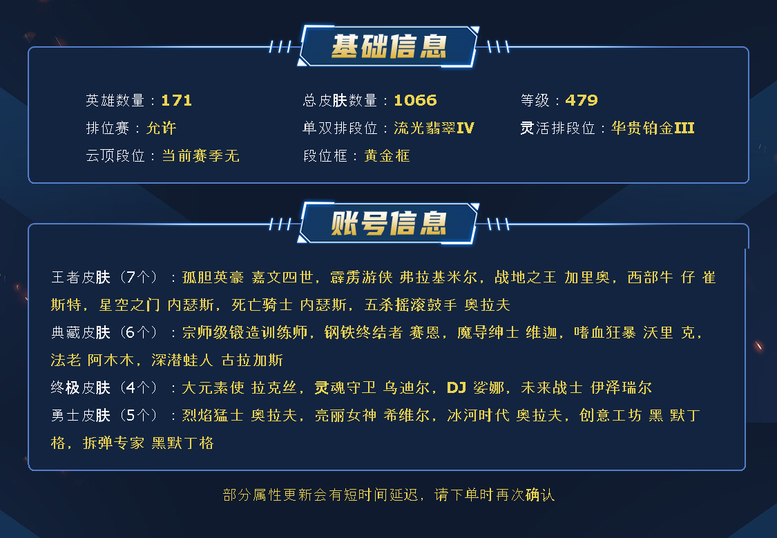 皮肤太多只截了部分图------------下单前查下游戏ID,确保段位是您所需要的,注意账号是否允许排位,避免浪费您的时间~