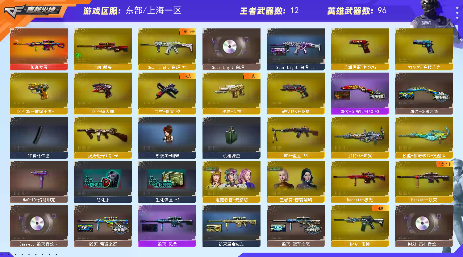 生化套装(朱雀+6烈5盘2炼+斯太尔-蝴蝶)、各种稀有玩偶、适用于挑战、爆破、生化的各种已解锁4防超稀有角色、炫彩背包及酷炫光效、屠龙-秘银。