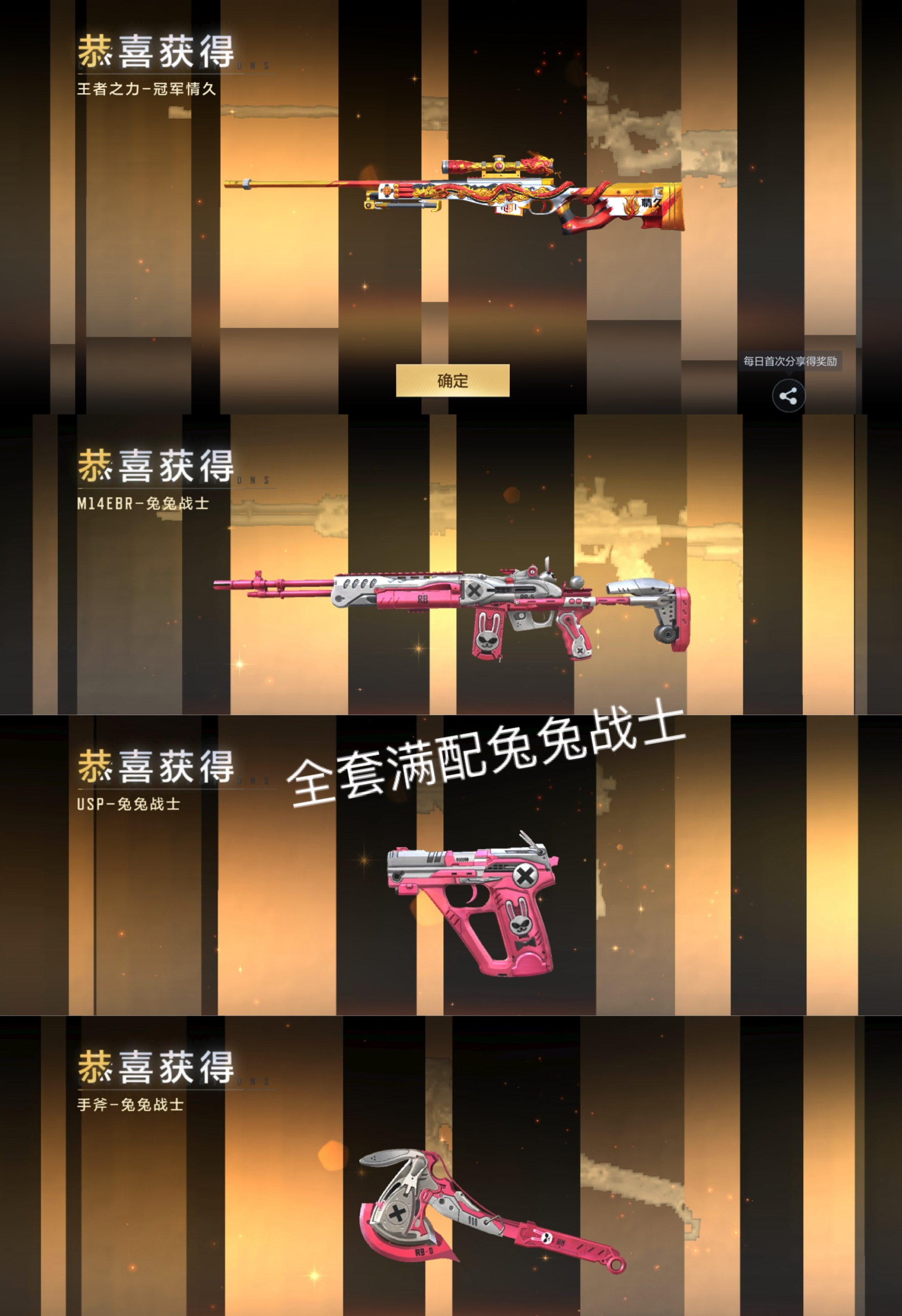 【套装】 M4A1雷霆王者至尊, 巴雷特雷霆王者至尊, 蝶至尊, 翎至尊, 狱至尊, 幻至尊 【武器】 王者之蝶, M4A1雷霆王者, 王者之翎, 王者之影, 王者之心*3, 巴雷特雷霆王者, 王者之力冠军情久王者之力,王力q9王力,王力Q9冠军王力,王力冠军王力,王力情久王力,王者幻神, 王者之神, 王者之狱, 王者之迹, 王者之隐*2, 雷霆王者之锋, 王者之痕, 王者之仞*2, M14EBR兔兔战士, USP兔兔战士,战斧兔兔战士,王者之锋*4, AN94盖, CZS2仲康, AK47奉先, AK47孟德, M4A1仲达, M4A1星象, M4A1游骑兵, MK47仁德, M200幻神, VEPR12宙斯, P90双脊龙, COP357堕天神*6, COP357旗袍, COP357雷神, COP357雷霆, COP357雷霆王者, MK23双脊龙, MK23幻神, MK23机械纪元*2, 炽芒蝶刃*2, 09式狙天神*2, 9A91天神, 9A91魔蜥觉醒*3, AA12火药, AA12火药觉醒, AA12雷神, AK47塔罗牌觉醒*2, AK47幸运日, AK47春雅觉醒, AK47木兰, AK47机械迷城, AK47樱斗士一觉, AK47沙漠郡主二觉, AK47火麒麟*2, AK47猩红传说, 王者之尊,王者81,AK47破空冰刃, AK47血武士*2, AK47谜城烟火, AK47雅韵青花*2, AK47雷暴, AK47雷麒麟, AK47风神翼龙*2, AK47黑鲨, AN94赳赳秦师, AN94超新星, AUG机械纪元, AWM大湾溢彩, CBJMS毒蜂, CZ75穷奇*2, CZ75策, CZ75龙映钟山觉醒, CZS2心动次元*3, CZS2血月, GLOCK18猎神, KSG极光, KSG火力竞放觉醒, M1216霸王龙, M12S雷霆, M200心动次元*4, M4A1冰锋觉醒, M4A1千变, M4A1卧龙, M4A1堕天神, M4A1夏清觉醒, M4A1太白诗仙*2, M4A1机械迷城, M4A1死神*3, M4A1海骑士, M4A1猎神, M4A1玫瑰精灵, M4A1竞界荣光, M4A1赛博雷神,黑龙魂, M4A1运输船*2, M4A1雷神*2, M4A1游骑兵荣耀大梦, M4A1游骑兵KZ,M4A1黑骑士, M4A1黑龙, M4A1龙血, MAC10孟获, MAC10风神翼龙, MK5魔鲲, Origin12机变奇蛇觉醒, P90突突兔觉醒, QSZ92冰魂觉醒, QSZ92华夏传说, SCAR印刷术, SCAR幽暗骑士*2, SCAR幽暗骑士觉醒, SCAR心动PICK, SCAR探星者, SCARLight白虎, USP太白诗仙, USP机械迷城*3, USP神罚*5, USP耀金伯爵, USP雷暴, 丛林匕首庆龙觉醒, 丛林匕首火力竞放*2, 修罗之刃, 刑天战斧, 剑齿虎, 剑齿虎炫彩, 匕首冰魂觉醒, 匕首浩瀚征途, 双持GLOCK18本初, 双持柯尔特极光, 双持沙鹰元让, 双管猎枪未来战士, 唐刀大唐荣耀*2, 啖睛矢, 嗜血金鲨, 地狱火*3, 地狱烈炎, 墨刃幻神, 太白诗仙扇, 女皇利刃铁胆虎魄*2, 寒霜烈龙, 尼泊尔蜻蜓*2, 屠龙, 左轮卧龙觉醒, 巴雷特冬灭觉醒, 巴雷特朱雀, 巴雷特极光, 巴雷特极光运动宝贝兰, 巴雷特毁灭*9, 巴雷特雷霆, 思召剑, 手斧机械迷城*4, 手斧竞技战魂, 擎天, 改装GLOCK樱龙·超觉, 斩魔刀, 方天画戟, 星芒*2, 暗杀星, 暗杀神, 末日裁决觉醒*2, 柯尔特伏刹山海觉醒, 毛瑟毒蜂, 气勇胆烈戟, 气手枪血月, 汤姆逊烈龙*2, 沙鹰修罗*3, 沙鹰宇航兔兔*2, 沙鹰神兵修罗*2, 沙鹰超新星, 沙鹰飞电*2, 清刚觉醒, 激昂霸王枪, 烈焰刀, 烈焰弓, 环刃炫光掠影觉醒, 甩棍卧龙觉醒, 百战巾帼枪, 破邪蛇棍觉醒, 神罚战斧*3, 秋逸觉醒, 耀金雷刃*3, 虎贲钩镰刀, 蛮神巨斧, 蝴蝶刀天神*2, 蟒蛇奉先, 蟒蛇火力竞放, 血阳, 铁锹超新星, 雷霆, 霸王龙斧, 马来剑毁灭*6, 马来剑耀金伯爵, 麒麟刺*2, 黄金生化钩觉醒, 龙啸, 龙鳞觉醒 【投掷】 投掷王者之竞手雷, 投掷王者之竞闪光弹, 投掷王者之竞烟雾弹, 投掷烟雾弹雷霆王者*2, 投掷闪光弹雷霆王者*2, 投掷高爆手雷雷霆王者*3, 投掷王者之圣烟雾弹, 投掷王者之圣闪光弹, 投掷王者之圣手雷, 投掷王者之兽烟雾弹*2, 投掷王者之兽闪光弹*2, 投掷王者之兽手雷*2, 投掷王者之势烟雾弹, 投掷王者之势闪光弹, 投掷王者之心烟雾弹*3, 投掷王者之心闪光弹*3, 投掷王者之心手雷*3, 投掷王者之影闪光弹, 投掷王者之影烟雾弹, 投掷王者之翼烟雾弹*2, 投掷王者之翼闪光弹, 投掷手雷云海游龙, 投掷高爆手雷无限*3, 投掷雷神烟雾弹*2, 投掷雷神闪光弹*3, 投掷雷神手雷*2, 投掷烟雾弹雷暴, 投掷高爆手雷雷暴, 投掷烟雾弹堕天神, 投掷闪光弹堕天神, 投掷烟雾弹雷霆, 投掷闪光弹雷霆, 投掷高爆手雷雷霆, 投掷闪光弹天使, 投掷分裂雷天使, 投掷机械纪元烟雾弹, 投掷机械纪元手雷, 投掷黑骑士烟雾弹*2, 投掷黑骑士手雷*3, 投掷幻兽手雷*5, 投掷烟雾弹游骑兵*3, 投掷燃烧弹游骑兵*6, 投掷黑武士烟雾弹, 投掷黑武士手雷*3, 投掷火麒麟烟雾弹, 投掷火麒麟手雷, 投掷死神烟雾弹, 投掷死神闪光弹*3, 投掷死神手雷*3, 投掷烟雾弹星际宇航, 投掷手雷游骑兵, 投掷手雷鼓龙, 投掷燃烧弹遁天梭剑鱼阵, 投掷粘性手雷附骨之虫觉醒, 投掷闪光弹幻灵, 投掷高爆手雷幻灵 【皮肤】 王者之腾冠军EP, 王者幻神冠军EP, 王者之魂白金血钻, 王者之锋白金血钻, 王者幻神紫电熔岩, 王者之锋紫电熔岩, 王者之影HeartShot, 王者之轮HeartShot*2, 王者之势烟雾弹HeartShot, 王者之心烟雾弹HeartShot, 王者之心闪光弹HeartShot, 王者之心手雷HeartShot*2, 王者之影烟雾弹HeartShot, 王者之影手雷HeartShot, 王者之翼烟雾弹HeartShot*4, 王者之翼闪光弹HeartShot*2, 王者之翼手雷HeartShot*2, 王者之魄HeartShot, 王者之心HeartShot, 王者之锋HeartShot*2, 王者之击HeartShot, 王者之兽冰霜奇迹, 王者之痕冰霜奇迹, 王者之仞冰霜奇迹*2, 雷霆王者之锋冰霜奇迹, 王者之狱冰霜奇迹, 巴雷特雷霆王者冰霜奇迹, COP357雷霆王者冰霜奇迹, 王者之隐冰霜奇迹, 烟雾弹雷霆王者冰霜奇迹*2, 闪光弹雷霆王者冰霜奇迹*2, 高爆手雷雷霆王者冰霜奇迹*2, 王者之圣烟雾弹冰霜奇迹,雷暴王者烟雾弹,雷暴王者闪光弹, 王者之圣手