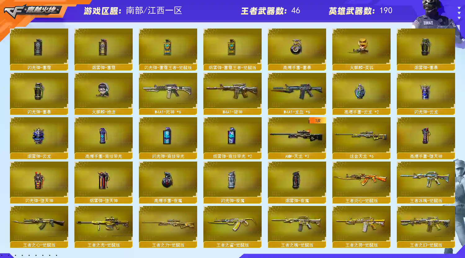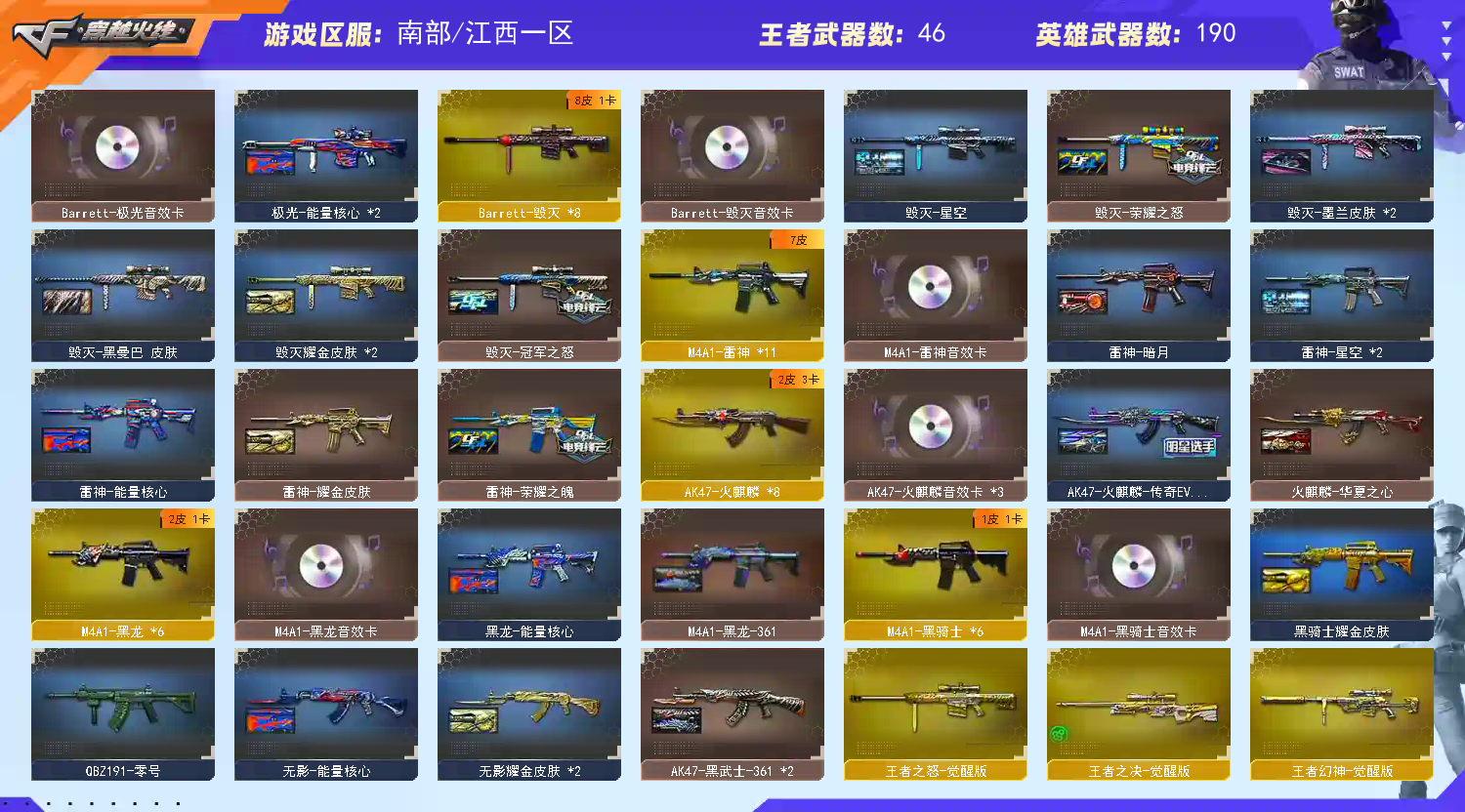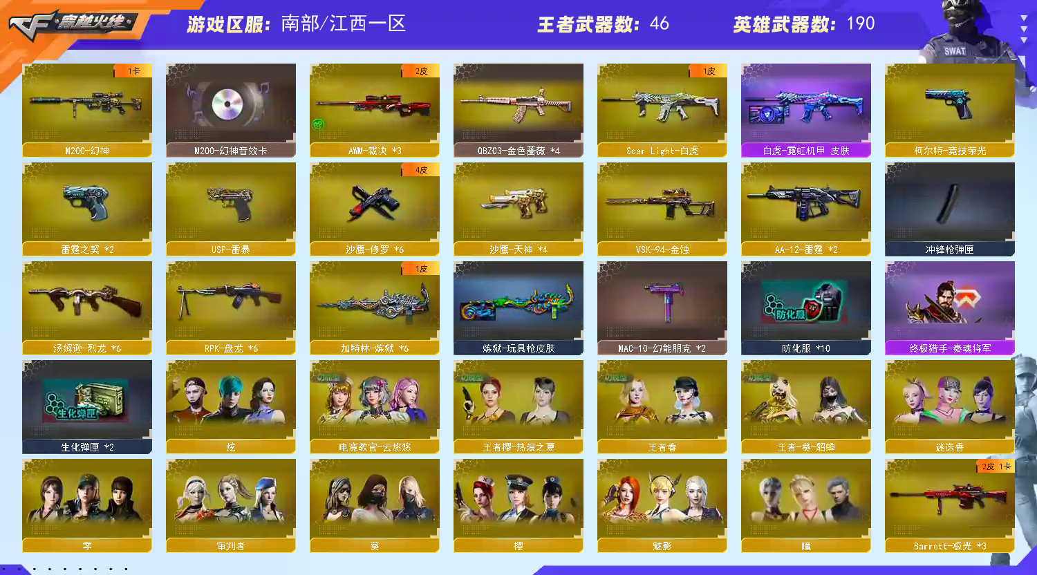 【主 武】:M200幻神(幻神音效卡)、VSK金蚀、M200竞技荣光、王者幻神觉醒、6烈龙死亡之眼、6盘龙加特林炼狱、HK朱雀、Sar白虎、王者炎心、王者之心X2、王者之翼、王者之影、王者之鲨、王者冰魄、王者之幻X2、王者之戮、王者之魄X5、王者之势X2、王者之武、王者之光、超新星悦享X4、王者之决、王者之力X2、王者之怒X4、炫金火麒麟、炫金无影X2、炫金武士、炫金黑龙、炫金雷神X2、炫金骑士X2、炫金千变、炫金毁灭X3、炫金天龙X6、千变、火麒麟(AG战队、CFS2018、传奇EVEN)X8、黑龙(361)X6、雷神(斗鱼、荣耀之魄)X8、黑骑士X6、无影(耀金)X3、死神X6、黑武士(361度)X9、天启X4、超新星X5、武圣X9、机械迷城、黑鲨X3、龙血X6、雷霆、玫瑰精灵X3、QBZ03-金色蔷薇X4、猎神、烈火X3、猩红传说、AK47-B-战神、黑武士-CF网剧冠军套装X2、黑骑士-海王X2、AK47-B-身先士卒、AK47-常胜、天龙(传奇白鲨)X2、毁灭(耀金、CFS2018、冠军之怒、荣耀之怒)X7、极光X2、裁决X3、Barrett金色蔷薇、Barrett-暗月传说、盘龙X6、加特林炼狱X5、烈龙X7、斯泰尔蝴蝶、AA12雷霆X2、极光毁灭者、神圣爆裂者、神罚、苍雷、乱世、末日毁灭者、冰龙粉碎者-白马银枪、试炼破坏者、机甲撕裂者、金魔等各种活动武器