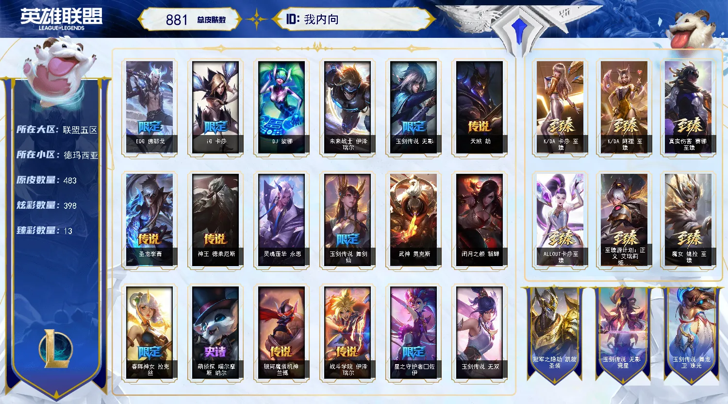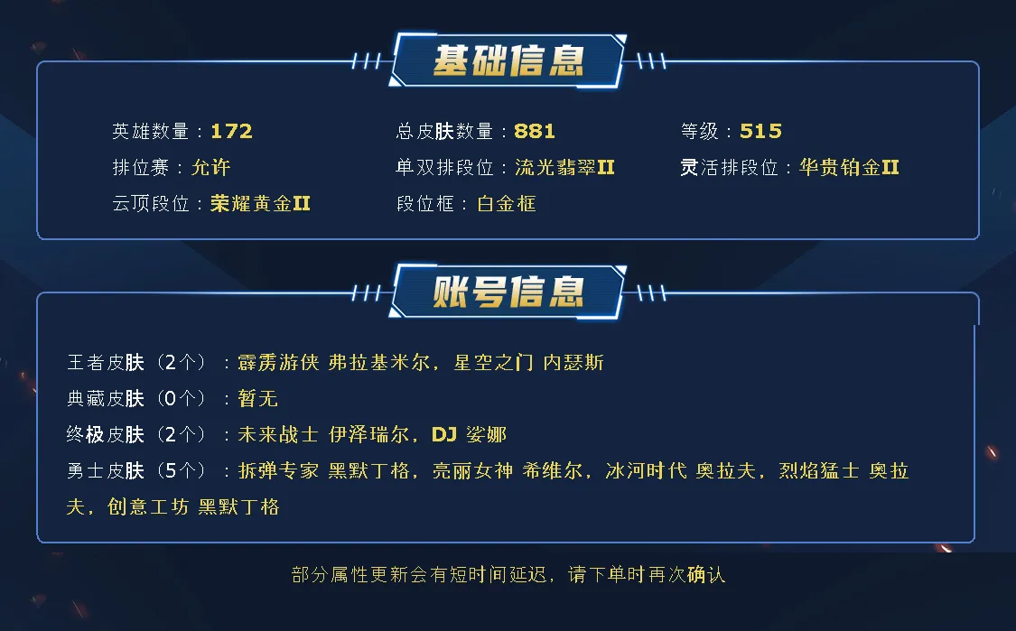 【全英雄可排位402原皮肤153炫彩皮肤】至臻刀妹、至臻塞拉斯、至臻婕拉、至臻EZ、海克斯乌鸦、海克斯炸弹人、海克斯波比、海克斯大嘴、剪纸仙灵刀妹、神凰行者霞、鼠年武器、星守佐伊、玉剑男刀、玉剑刀妹、狗年光辉、电玩锐雯、龙琴、羊年金克丝、青花瓷EZ、光明哨兵薇恩、战斗学院女警、灵魂莲华阿狸、灵能特工琴女、神龙尊者瞎子、战斗学院EZ、永恒之森奥恩、EDG厄斐琉斯、EDG佛耶戈、穿心之剑剑姬、养蜂人、泳池皇子、泳池女警、情人节辛德拉、征服者卡尔玛、DWG卡牌、至高天烬、至高天薇古丝、净雪之月凯隐、战斗学院永恩、咖啡甜心格温、咖啡甜心希维尔、莫测之影卡蜜尔、幽梦玫瑰泽丽、太空律动兰博、太空律动狗头、太空律动莎弥拉、破败军团德莱文、狮子星神豹女、猎户星神韦鲁斯、灵魂莲华永恩、灵魂莲华亚索、灵魂莲华薇恩、新K/DA阿卡丽、新K/DA卡莎、神龙尊者瑟提、灵能特工派克、灵能特工EZ、永恒之森霞、屠龙勇士巨魔、屠龙勇士老鼠、古神梦魇、黑暗骑士赵信、冠军之隐、破空枪骑、万圣节卡特、甜心之羽霞、泳池岩雀、奥德赛凯隐、暗星尊烬、黎明奶妈、神拳、神王诺手、天煞劫、屠龙勇士潘森、西部天使寒冰、真实伤害艾克