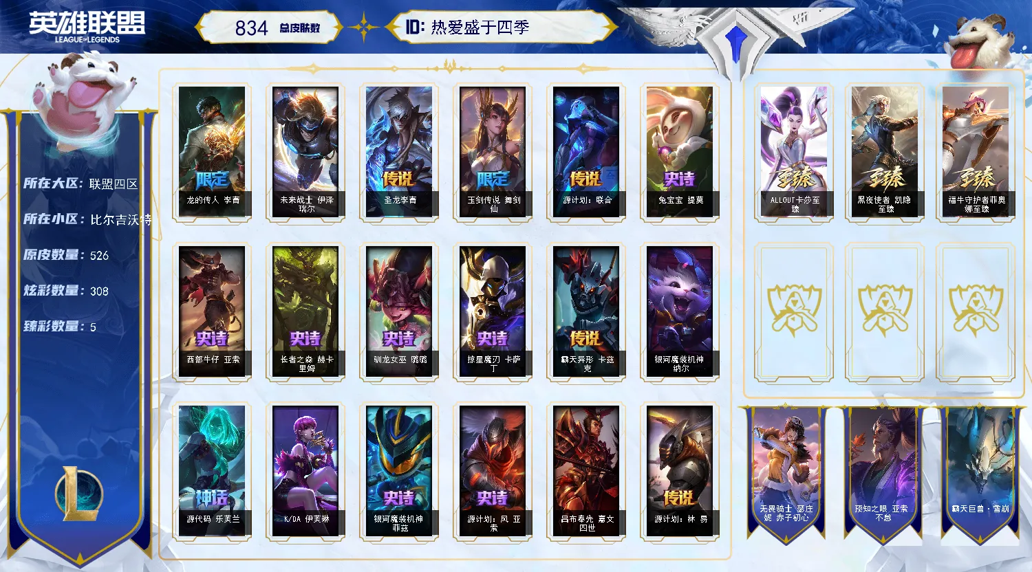 【比尔吉沃特453原皮】至臻凯隐丶新至臻卡莎丶至臻剑姬丶龙年瞎子丶虎年皎月丶马年皎月丶猪年塔姆丶龙瞎