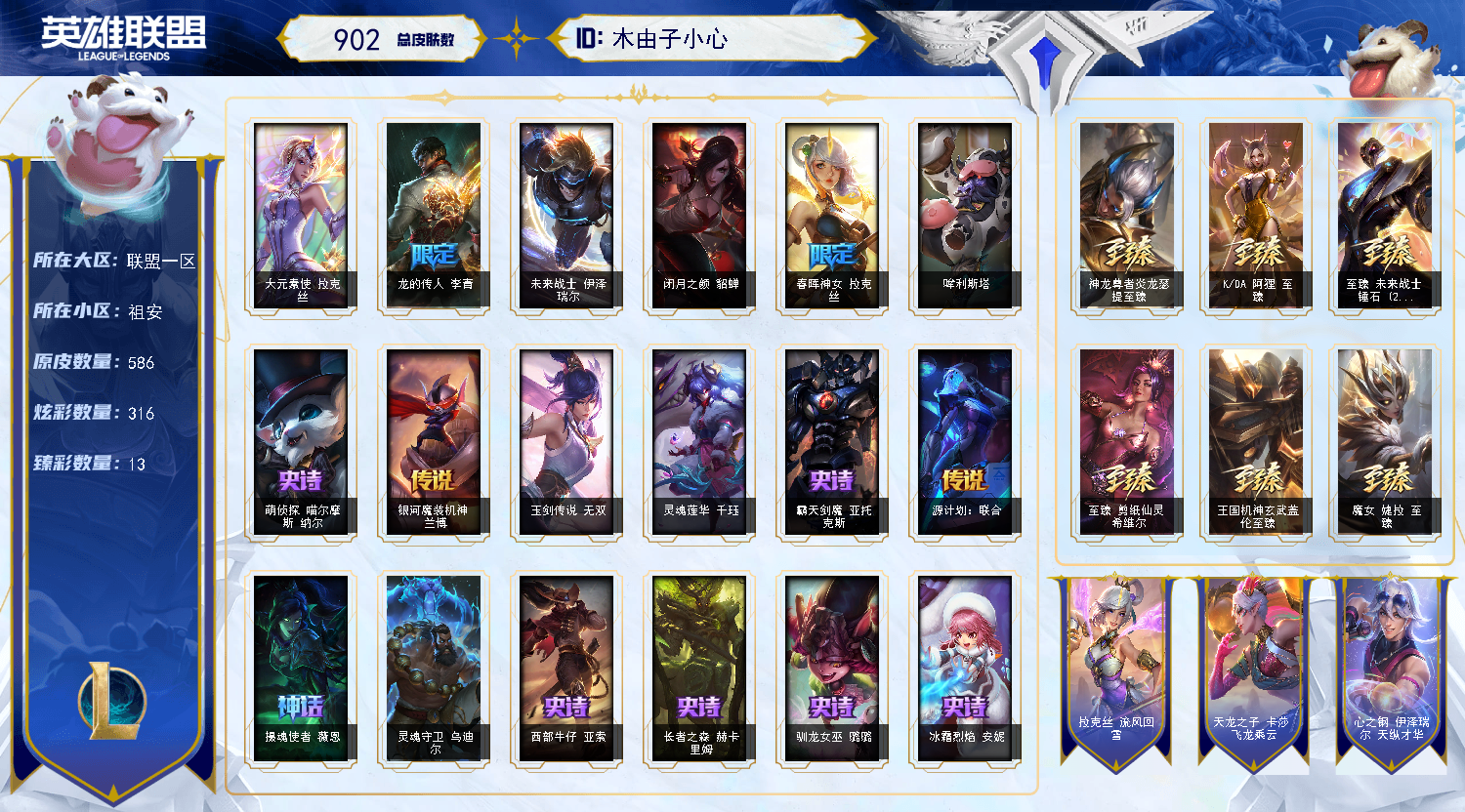 【全英雄可排位516原皮肤190炫彩皮肤】至臻提莫、至臻瑟提、新至臻卡莎、至臻莫甘娜、至臻锤石、至臻婕拉、至臻奶妈、至臻卢锡安、至臻盖伦、至臻EZ、至臻剪纸仙灵希维尔、摄魂VN、海克斯鳄鱼、海克斯炸弹人、海克斯小炮、新创战纪希维尔、海克斯牛头、黎明使者卡尔玛、龙瞎、马年皎月、狗年狗头、狗年拉克丝、狗年狼人、蛇年蛇女、电玩阿狸、龙年猴子、虎痴之拳蔚、羊年金克丝、猴年莫甘娜、征服者卡尔玛、征服者韦鲁斯、屠龙勇士凯尔、大元素使拉克丝、灵魂守卫、未来战士EZ、奥德赛炸弹人、鸡里奥、克格汪、送披萨的小姐姐、觅心魔灵发条、觅心游侠卢锡安、情人节卢锡安、觅心之翼奎因、情人节奎因、魄罗骑士、万圣节人马、勇者豹女、暗星锤石、未来战士女警、西部天使艾希、西部寒冰、星守金克丝、源计划薇恩、源计划VN、源计划寒冰、源计划艾希、奥德赛金克丝、奥术师萨科、貂蝉、弹幕天使卡莎、德玛西亚警官卢锡安、黑潮皎月、柯基库奇、双城之战全套、未来战士卡牌、未来战士锐雯、西部魔影人马、星守妮蔻、星守辛德拉、永恒之森小法、宇航员波比、玉剑传说剑圣、玉剑传说剑姬、源计划阿卡丽、源计划蔚、战斗教授男枪、战斗学院杰斯、战斗学院卡特琳娜