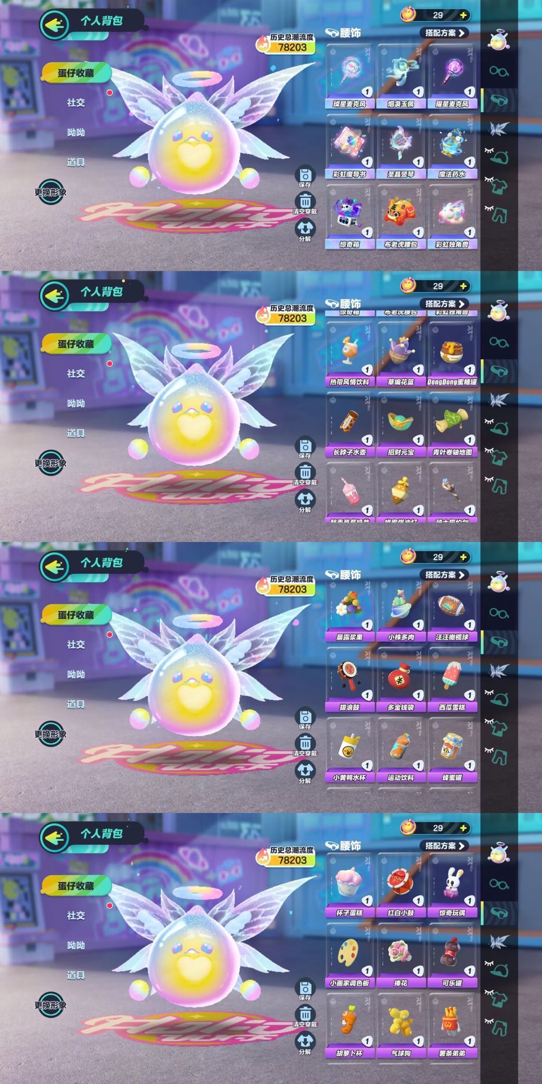 腰带装饰【曜星麦克风,璨星麦克风,烟袅玉佩,彩虹魔导书,圣晶坚琴,魔法药水,惊奇箱,布老虎腰包,彩虹独角兽,热带风情饮料,草编花蓝,长脖子水壶,招财元宝,青叶卷轴地图,拨浪鼓,多金钱袋,西瓜蛋糕,小黄鸭水杯,运动饮料,蜂蜜罐,杯子蛋糕,可乐罐,胡萝卜杯,气球狗,薯条弟弟,游戏机,等等】~~~~~~~~~背包物品【月白大翅膀,蝴蝶之梦,绘山河折纸,电极蝴蝶结,飞飞甜品宝箱,魔女的眷属,魔镜,木偶,长颈鹿背包,呆兔背包,裴玉如意,平底锅,云雀小窝,麻将牌,糖果抱枕,云朵背包,迷彩滑板,小黄鸭背包,微笑向日葵,甜心蝴蝶结,长耳背包,等等..】