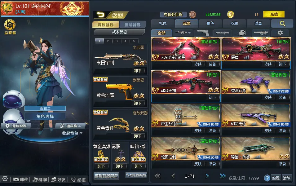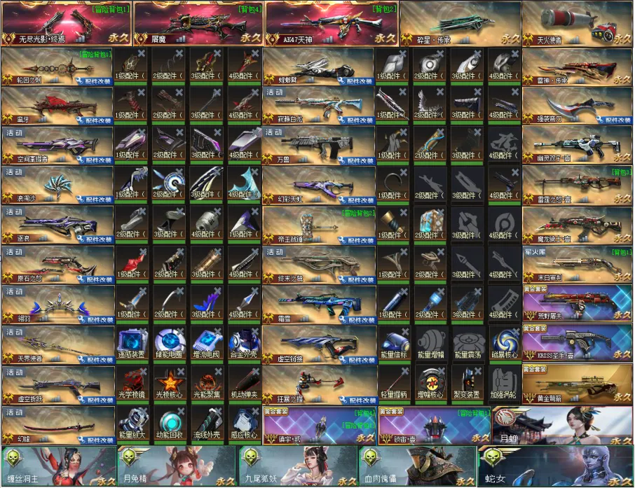 【配件武器】[满配轮回之刺][满配蛮牙][满配空间掌握者][满配浪淘沙][满配逐浪][满配原石之怒][满配翎羽][满配天界使者][满配虚空折跃][满配幻锋-影生][满配螳螂臂][满配寂静白龙][三配万兽][三配狂暴之握][三配霜雪][二配幻彩天虹][二配终末之弩][二配虚空链接][二配帝王战锤]