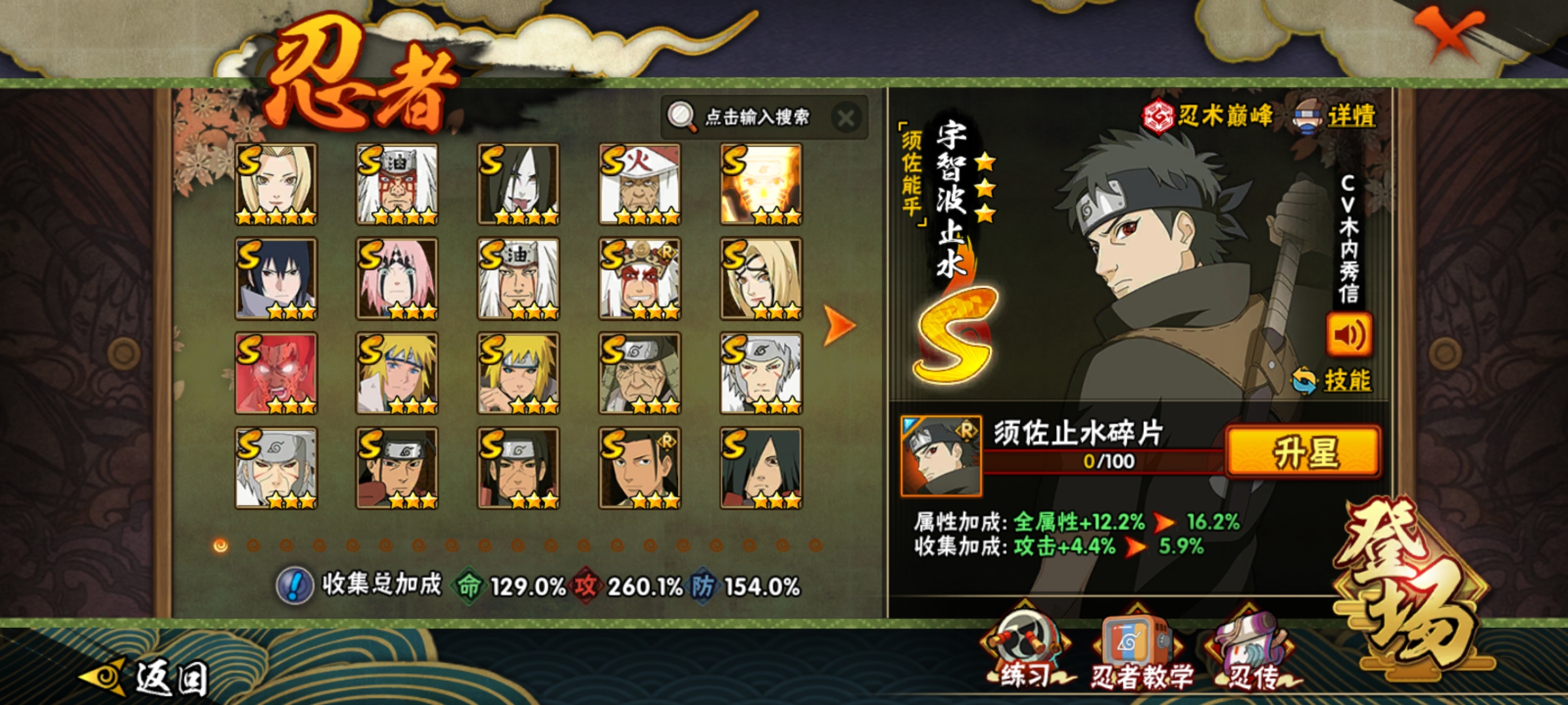 300忍者S级忍者(38个) : 猿飞日斩,自来也「仙人模式」,宇智波鼬「须佐能乎」 ,自来也,纲手,波风水门,大蛇丸,佩恩「天道」神秘面具男,女「四代目雷影J千手柱间,宇智波斑,长门「秽土转生」,宇智波带土「漂泊浪客」,金角银角「秽土转生 J波风水门[秽士转生」,无二代目土影」,纲手「百豪」,千手扉间「秽土转生」,宇智波斑「白面具」宇智波斑「秽土转生」,药师兜「仙人模式」,佩恩天道「超」,自来也「舞之豪杰」,宇智波鼬「[秽 土转生」千手柱间「秽土转生」,宇智波带土「忍界大战」宇智波斑「木叶创立」迈特凯「死门」大野木「忍界大战」,漩涡鸣人「九喇嘛连结」 ,大筒木金式「博人传」 ,春野櫻体验40S「忍界大战」,神秘面具男 「红夜之刃」宇智波佐助「永恒万花筒」 ,千手柱间「木叶创立」 ,宇智波斑「秽土转生.解」 ,大筒木桃式