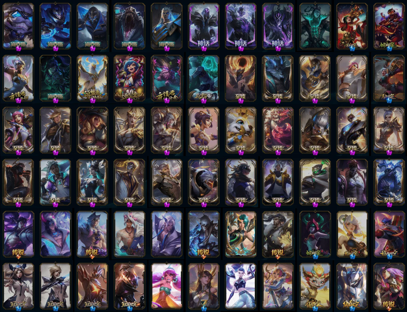 【传说皮肤】黯黑魔龙希瓦娜 暗星锤石 暗星女王拉克丝 霸天零式赛恩 霸天异形卡兹克 冰川巨兽墨菲特 冰霜亚龙希瓦娜 冰霜之刃艾瑞莉娅 电玩女神娑娜 第三类接触黑默丁格 地狱行者孙悟空 地狱之门卫士加里奥 钢铁军团盖伦 钢铁之翼凯尔 光明哨兵格雷福斯 灌篮高手德莱厄斯 鬼魂新娘莫甘娜 黑夜使者亚索 红色男爵库奇 金牌主播德莱文 枯萎之壤泽拉斯 炼狱魔犬内瑟斯 烈焰雄心崔丝塔娜 黎明使者永恩 灵魂莲华锤石 灵魂莲华瑟提 灵能特工娑娜 陆地王者4WD布里茨 律政大亨蒙多 女帝卡特琳娜 女皇艾希 女主播迦娜 神龙尊者圣龙李青 神龙尊者昼日真龙亚索 神拳李青 绅士科加斯 神王德莱厄斯 神王盖伦 双重冰晶艾尼维亚 死亡骑士盖伦 太空律动猫猫布里和里茨 天煞劫 铁哥们儿奥拉夫 屠龙勇士潘森 未来战士凯特琳 西部魔影大小姐蕾欧娜 西部魔影卢锡安 西部天使赛娜 血石领主弗拉基米尔 驯龙学者黑默丁格 焰尾妖狐阿狸 耀星女神拉克丝 泳池派对吉格斯 源计划联合艾希 源计划林易 约德尔国队长提莫 宇航员诺提勒斯 战斗学院凯特琳 真实伤害艾克 最终BOSS维迦