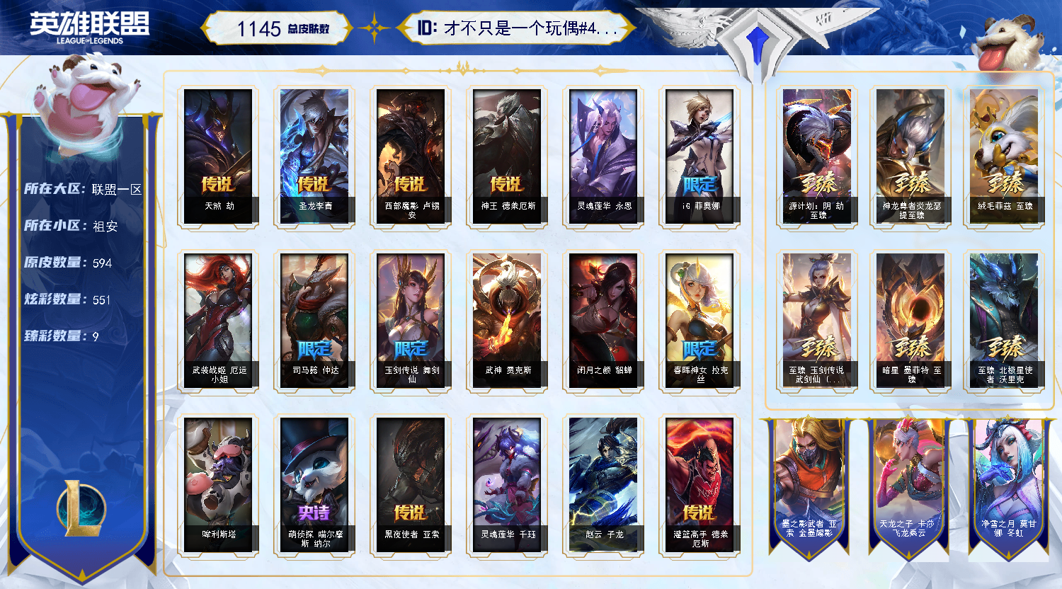 【重要皮肤】DRX亚托克斯至臻 北极星使者沃里克至臻 至高天奎桑提至臻 星之守护者辛德拉至臻 星之守护者艾克至臻 西部魔影猎天使恶魔泰隆至臻 幻灵战斗猫金克丝至臻 青花瓷拉克丝至臻 魅惑女巫莫甘娜至臻 女帝黛安娜至臻 魔女乐芙兰至臻 真实伤害亚索至臻 真实伤害赛娜至臻 灵能特工伊泽瑞尔至臻 福牛守护者菲奥娜至臻 源计划逆流塞拉斯至臻 源计划阴劫至臻 暗星墨菲特至臻 神龙尊者炎龙瑟提至臻 神龙尊者均衡之龙沃利贝尔至臻 征服者贾克斯至臻 飞升战神潘森至臻 焰执事布兰德至臻 绒毛菲兹至臻 玉剑传说武剑仙至臻 玉剑传说武剑仙2022至臻 未来战士锤石至臻 未来战士锤石2022至臻 灰烬守护者慎 灰烬骑士派克 灰烬征服者潘森 海克斯科技雷克顿 海克斯科技斯维因 海克斯科技吉格斯 海克斯科技波比 海克斯科技嘉文四世 海克斯科技阿利斯塔 永恒之森奥恩 黎明使者卡尔玛 摄魂使者薇恩 胜利女神娑娜 胜利之王泰达米尔 胜利巨口克格莫 电玩女神阿狸 玉剑传说舞剑仙 玉剑传说神机花火 玉剑传说无劫 天龙之子斯莫德 龙腾虎跃瑟提 替父从军花木兰 神龙烈焰金克丝 碧玉之牙卡西奥佩娅 春晖神女拉克丝 美猴王孙悟空 定海神珍孙悟空 司马懿仲达 烈焰美人薇恩 神龙之翼库奇 王国机神苍狼瑟提 福牛守护者厄斐琉斯 福牛守护者德莱厄斯 福牛守护者阿利斯塔 福牛守护者嘉文四世 胜利女神瑟庄妮 胜利之剑亚托克斯 碎心之拳蔚 冬境仙灵索拉卡 狂心冰王图奇 魄罗骑士瑟庄妮 夺命美人卡特琳娜 泳池派对嘉文四世 泳池派对李青 克格汪 制胜金靴李青 制胜金球拉莫斯 DWG烬 FPX锤石 FPX李青 iG艾瑞莉娅 iG菲奥娜 SSG纳尔 SKTT1伊莉丝 SKTT1雷克顿 SSW图奇 SSW辛吉德 SKTT1贾克斯 SKTT1薇恩 暗杀星蒙多 Fnatic古拉加斯 Fnatic嘉文四世 冰雪节格雷福斯 冰雪节辛吉德 防暴士兵格雷福斯 防暴士兵辛吉德 防暴天使凯尔 冠军典狱长锤石 冠军掠夺者卡兹克 冠军之志瑞兹 鬼影森森茂凯 鬼影重重魔腾 胡桃夹子萨科 警用试作体K9内瑟斯 蓝色忧郁崔斯特 圣诞狂欢基兰 圣诞老人古拉加斯 圣诞玩偶波比 圣诞驯鹿克格莫 糖果使徒费德提克 外星装甲库奇 喜庆之树茂凯 野兽猎人泰达米尔 永恒之森乐芙兰 暗影沃里克 阿木木主人不要我了 2021全球总决赛嘉文四世 波比的巧克力工坊 都铎王朝图奇 十五周年纪念希维尔 十周年纪念安妮 源代码乐芙兰 神凰行者瑞羽圣凰艾尼维亚 胜利凤凰艾尼维亚 武装战姬厄运小姐 绝息圣堂洛