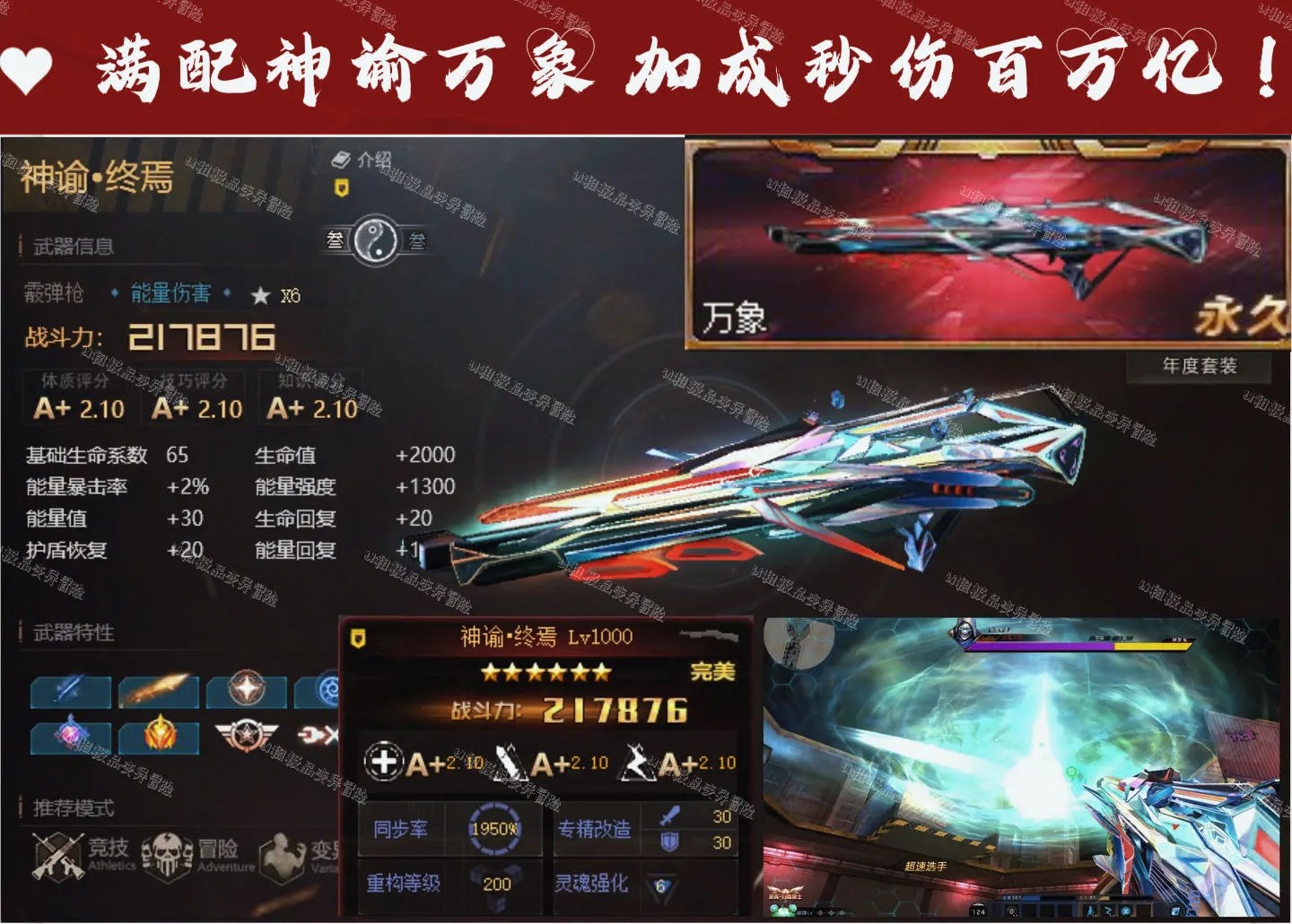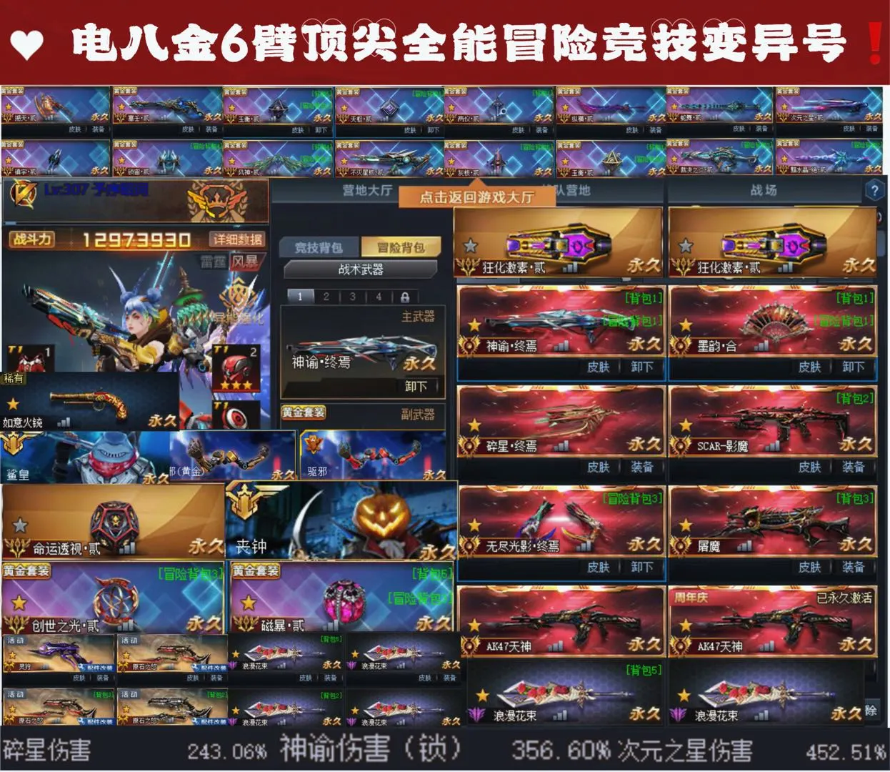 最强冒险👑✨1400W战黄金六臂满配神谕✨9传说全满配件武器✨全彩金灰核贰纵横贰✨全英雄双激素贰