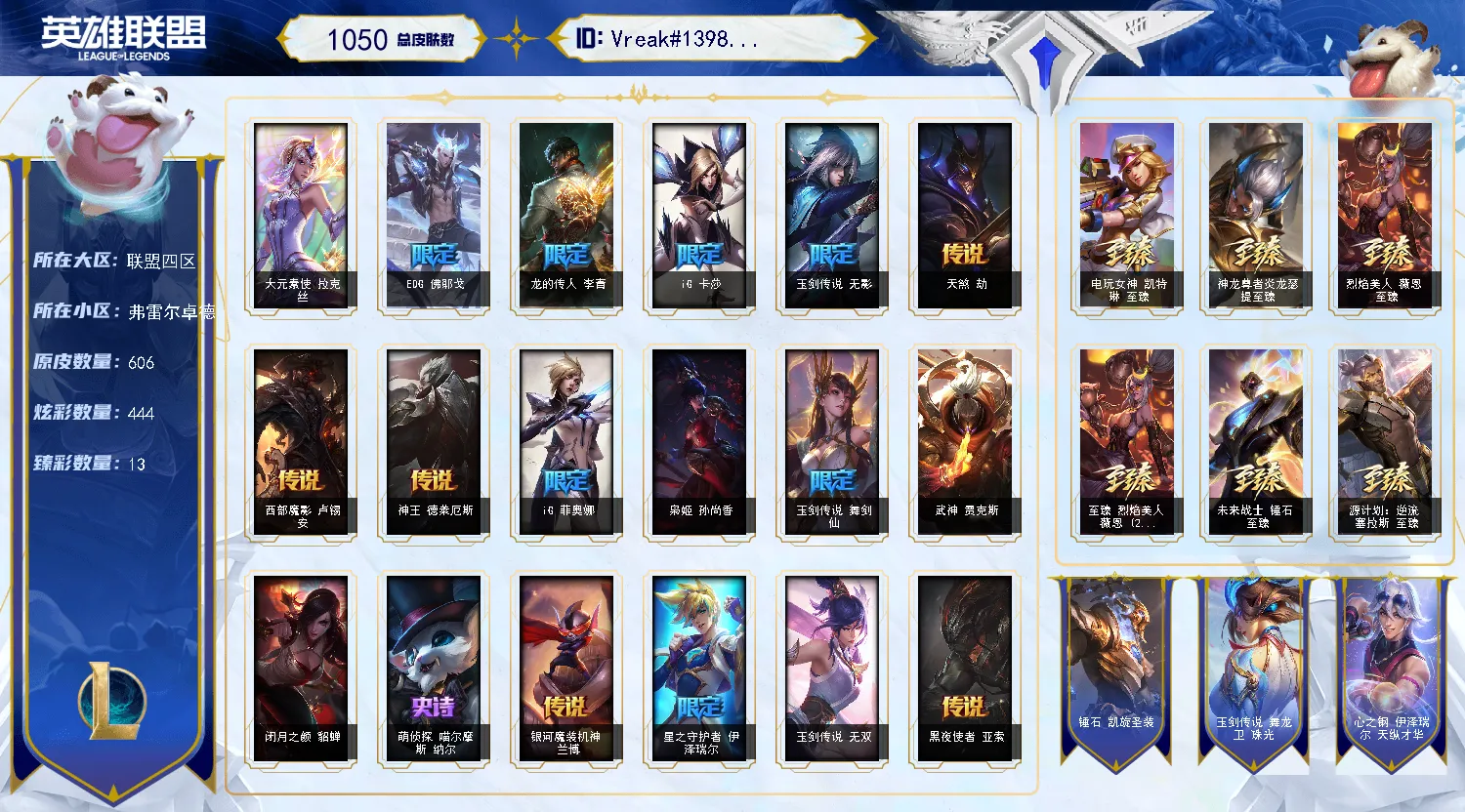 【重要皮肤】海珀利安小队X09星环灵风迦娜至臻 星之守护者艾克至臻 西部魔影猎天使恶魔泰隆至臻 幻灵战斗猫金克丝至臻 女帝黛安娜至臻 太空律动璐璐至臻 魔女乐芙兰至臻 奥术师佐伊至臻 灵能特工伊泽瑞尔至臻 福牛守护者菲奥娜至臻 源计划逆流塞拉斯至臻 王国机神玄武盖伦至臻 神龙尊者炎龙瑟提至臻 黑夜使者凯隐至臻 征服者贾克斯至臻 焰执事布兰德至臻 KDA二代卡莎至臻 烈焰美人薇恩至臻 烈焰美人薇恩2022至臻 电玩女神凯特琳至臻 电玩女神凯特琳2022至臻 魅惑女巫厄运小姐至臻 源计划正义艾瑞莉娅至臻 源计划正义艾瑞莉娅2022至臻 玉剑传说武剑仙至臻 玉剑传说武剑仙2022至臻 未来战士锤石至臻 未来战士锤石2022至臻 黑夜使者李青至臻 黑夜使者李青2022至臻 灰烬杀手塞拉斯 海克斯科技安妮 海克斯科技雷克顿 海克斯科技嘉文四世 海克斯科技崔丝塔娜 黎明使者卡尔玛 零之枪骑赫卡里姆 新创战纪希维尔 胜利女神娑娜 胜利之王泰达米尔 钢铁军团拉克丝 电玩勇者锐雯 星之守护者伊泽瑞尔 玉剑传说无影 玉剑传说舞剑仙 神凰行者幽羽玄凰萨勒芬妮 神凰行者烈羽焰凰霞 海珀利安小队Y03权天使卡蜜尔 灵能特工易 龙的传人李青 北辰之威内瑟斯 玉净夜叉凯特琳 广寒仙子嫦娥 神龙之翼库奇 福牛守护者厄斐琉斯 胜利机器人布里茨 胜利女神奥莉安娜 胜利枪神格雷福斯 胜利枪神卢锡安 胜利之剑亚托克斯 幽梦玫瑰伊莉丝 甜心之翎洛 觅心游侠卢锡安 幽梦玫瑰泰隆 圣诞老人布隆 冬季仙境卡尔玛 平安夜女神娑娜 圣诞糖果棒厄运小姐 伯爵卡萨丁 泳池派对凯特琳 泳池派对佐伊 泳池派对辛德拉 泳池派对厄运小姐 泳池派对菲奥娜 泳池派对格雷福斯 送披萨的小姐姐希维尔 EDG厄斐琉斯 EDG佛耶戈 EDG格雷福斯 iG卡蜜尔 iG洛 iG卡莎 iG艾瑞莉娅 iG乐芙兰 iG菲奥娜 SSG嘉文四世 SKTT1烬 SKTT1艾克 SKTT1奥拉夫 SKTT1瑞兹 SKTT1伊莉丝 SSW图奇 SSW辛吉德 SKTT1贾克斯 暗杀星伊泽瑞尔 Fnatic卡尔萨斯 冰雪节格雷福斯 冰雪节辛吉德 冰雪兽纳尔 防暴士兵格雷福斯 防暴士兵辛吉德 防暴天使凯尔 钢铁之翼艾尼维亚 冠军典狱长锤石 冠军蔷薇乐芙兰 冠军之隐劫 鬼影重重魔腾 胡桃夹子萨科 惊悚派对阿木木 密林猎手提莫 破空枪骑孙悟空 圣诞精灵崔丝塔娜 圣诞开心鬼提莫 圣诞老人古拉加斯 无头骑士赫卡里姆 邪恶圣诞老人维迦 幸福女神乐芙兰 雪默丁格 英勇玩具兵普朗克 暗影沃里克 冠军之箭艾希 魅惑女巫辛德拉 阿木木主人不要我了 都铎王朝图奇 十五周年纪念希维尔 十周年纪念安妮 源代码乐芙兰 神凰行者瑞羽圣凰艾尼维亚 胜利凤凰艾尼维亚 大元素使拉克丝