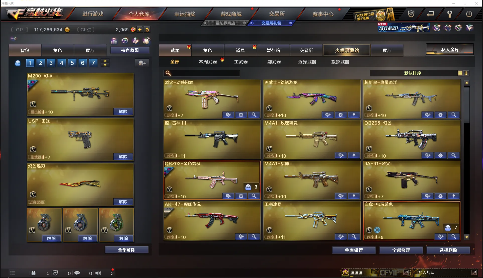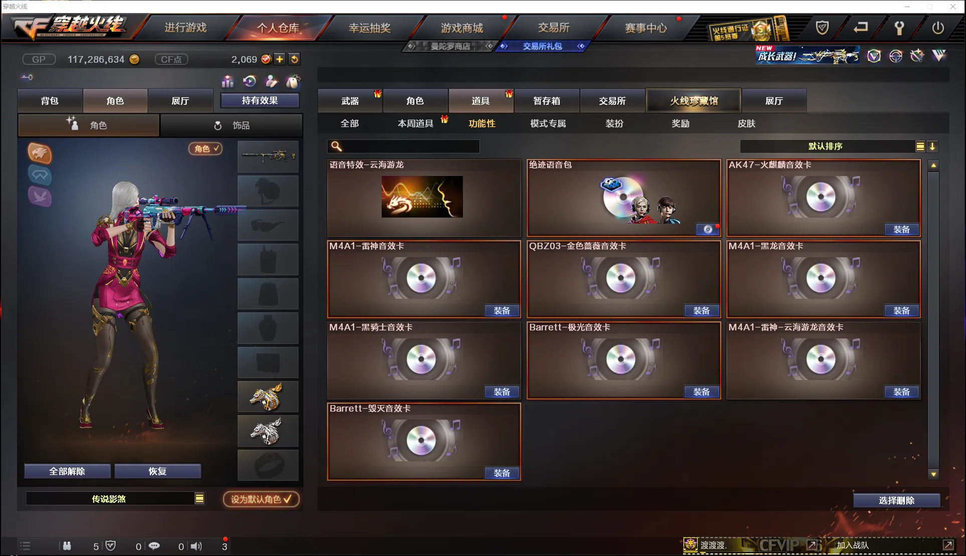 【道 具】:幻神音效卡、火麒麟音效卡、雷神音效卡、qb金色蔷薇音效卡、黑龙音效卡、黑骑士音效卡、极光音效卡、毁灭音效卡、、小红玩偶、暴躁猪猪玩偶、枪娘雷安娜玩偶、14个背包、AC(防弹衣+防弹头盔)、C4工具钳、手雷包、挑战弹夹、夺命之镰、变异宝贝、灵魂忍者、生化弹夹、防化服、机枪弹夹、冲锋枪弹夹、散弹枪弹夹、手枪弹夹、狙击枪弹夹、步枪弹夹、减少停顿包