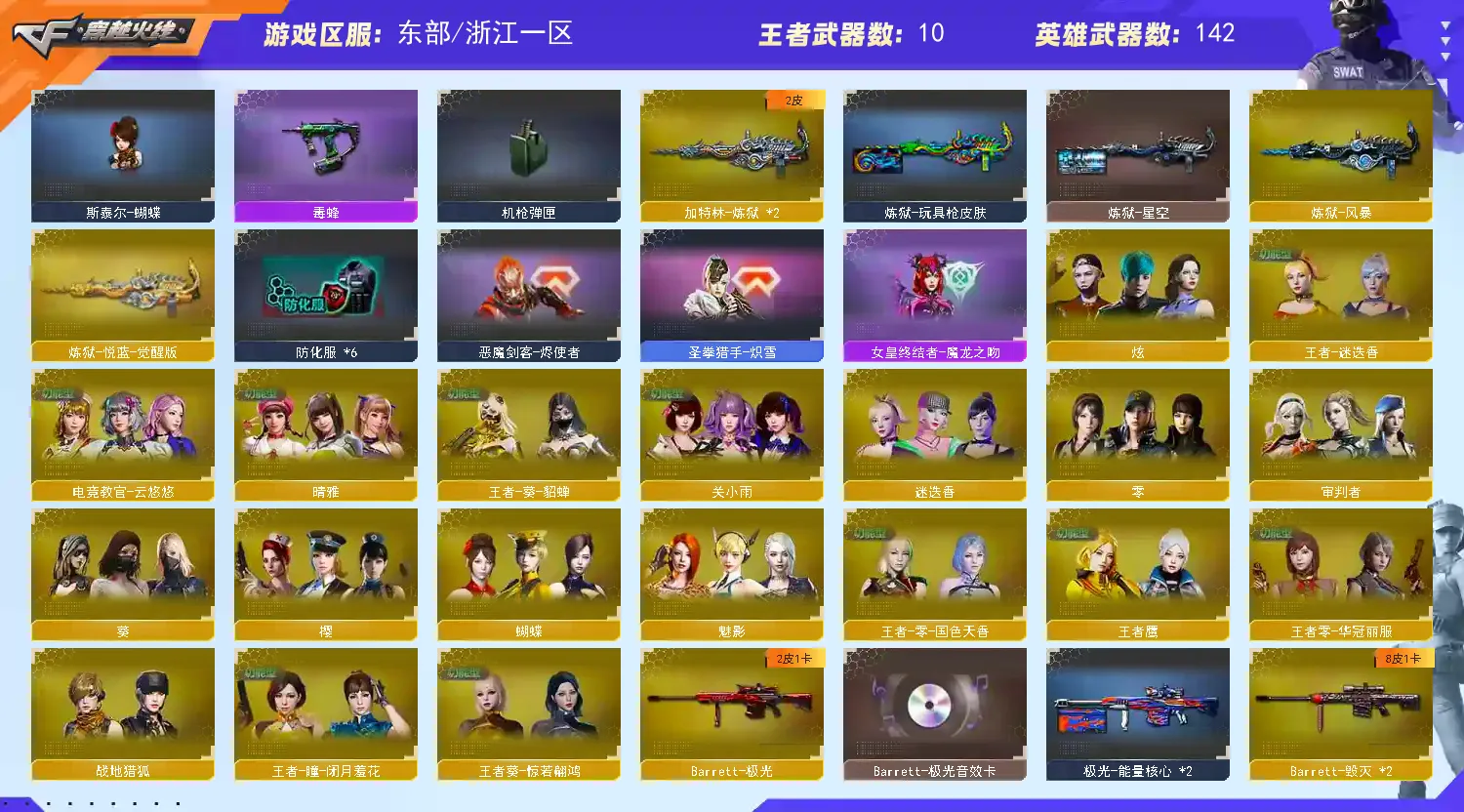 【角 色】:传说影煞、王者鹰、关小雨、蝴蝶、葵、零、迷迭香、晴雅、审判者、王者葵貂蝉、王者零国色天香、王者迷迭香、王者瞳闭月羞花、王者葵惊若翩鸿、王者零华冠礼服、樱、炫、隼、魅影、空、灵魂在职业经理、幽、职业选手(绝迹语音包)、风暴女、救世主-X、蜀雪、铁骑荣耀、影舞者-X、8周年戒指、双蛇戒指、双龙戒指
