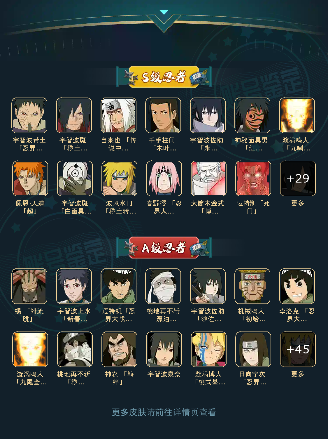 战力:1919W+;VIP13级;S忍41个;A忍49个,通灵兽21个,S忍:5星大蛇丸,5星纲手(普通),5星猿飞日斩(普通),4星波风水门(普通),九喇嘛连结漩涡鸣人,永恒万花筒宇智波佐助,忍界大战春野樱,仙人模式自来也,自来也(普通),舞之豪杰自来也,百豪纲手,死门迈特凯,秽土转生波风水门,秽土转生猿飞日斩,千手扉间(普通),秽土转生千手扉间,千手柱间(普通),秽土转生千手柱间,木叶创立千手柱间,宇智波斑(普通),秽土转生宇智波斑,木叶创立宇智波斑,须佐能乎宇智波鼬,秽土转生宇智波鼬,神秘面具男(普通),白面具宇智波斑,忍界大战宇智波带土,红夜之刃神秘面具男,四代目风影罗砂,二代目水影鬼灯幻月,四代目雷影艾,三代目雷影艾,三代目土影大野木,秽土转生半藏,二代目土影无,天道佩恩,超佩恩天道,秽土转生长门,仙人模式药师兜,博人传大筒木金式, ;A忍:5星猿飞阿斯玛(普通),5星飞段(普通),5星迈特凯(普通),5星蝎(普通),5星干柿鬼鲛(普通),5星死司凭血飞段,4星疾风传我爱罗,3星奇拉比(普通),3星青年艾,3星宇智波止水(普通),3星宇智波鼬(普通),3星迪达拉(普通),3星青年波风水门,3星半蛇斗篷药师兜,3星仙人模式漩涡鸣人,须佐能乎宇智波佐助,万花筒写轮眼宇智波佐助,九尾查克拉漩涡鸣人,忍界大战秋道丁次,百豪春野樱,志村团藏,青年长门,角都(普通),地怨虞角都,晓大蛇丸,忍界大战日向宁次,忍界大战勘九郎,桃地再不斩,漂泊武士桃地再不斩,忍界大战奇拉比,小南(普通),忍界大战迈特凯,五代目水影照美冥,近松十人卫千代,万花筒写轮眼旗木卡卡西,新春限定小南,漂泊武士千手扉间,夏日泳装小南,新春限定宇智波止水,忍界大战我爱罗,新春限定宇智波鼬,木叶上忍猿飞木叶丸,五代目雷影达鲁伊,暴怒宇智波带土,秽土转生迪达拉,火之意志继承者卑留呼,六代目水影长十郎,加藤断,四代目土影黑土, ;通灵兽:忍犬(普通),蓝蛇,蛤蟆吉,忍龟,山椒鱼,镰