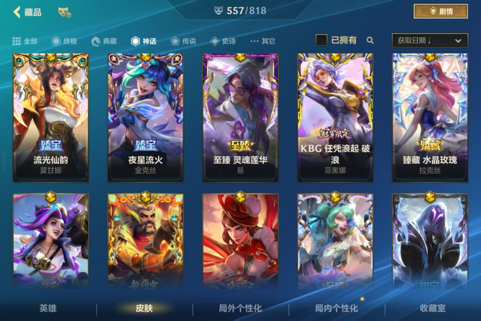 【安卓】 编号q87/4典藏11神话557皮/马年全套秒白龙回城全系列水晶玫瑰全年限神话剑姬传承金克丝灰烬