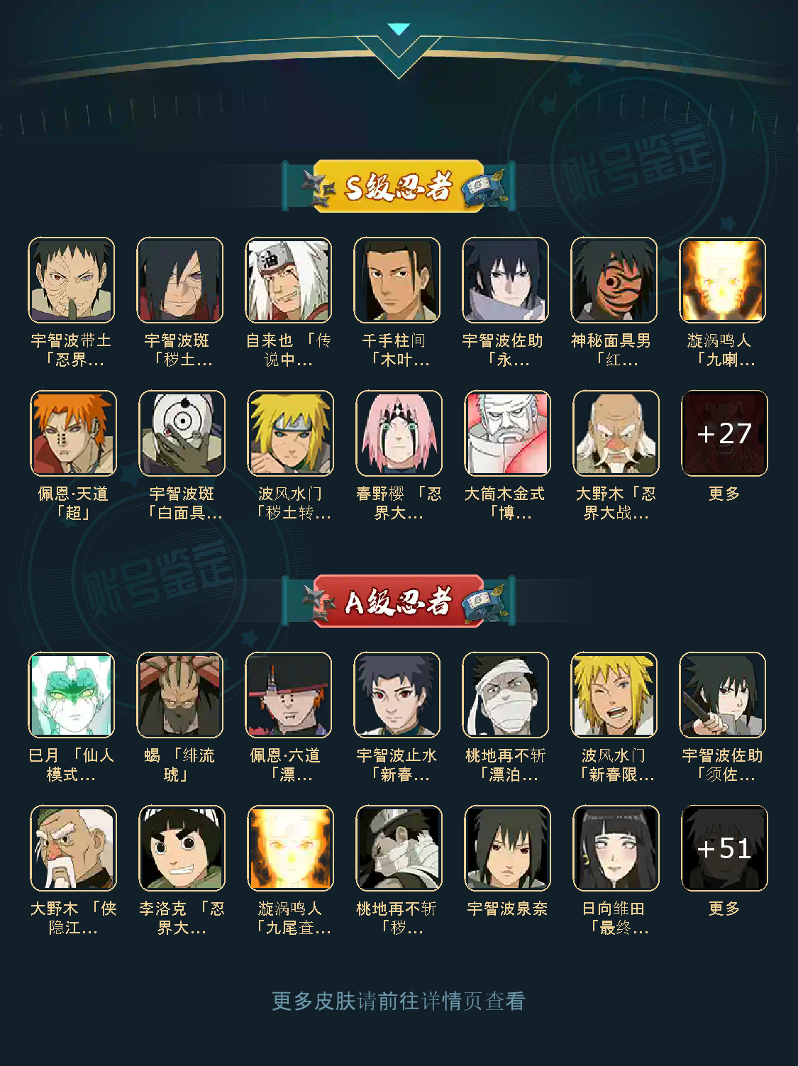 VIP12级;S忍40个;A忍55个,通灵兽20个,S忍:大蛇丸普通纲手九喇嘛鸣人永恒万花筒佐助忍战樱百豪纲手死门凯波风水门普通自来也豪杰自来也秽土水门猿飞日斩秽土猿飞秽土扉间千手柱间秽土柱间木叶创立柱间宇智波斑秽土斑秽