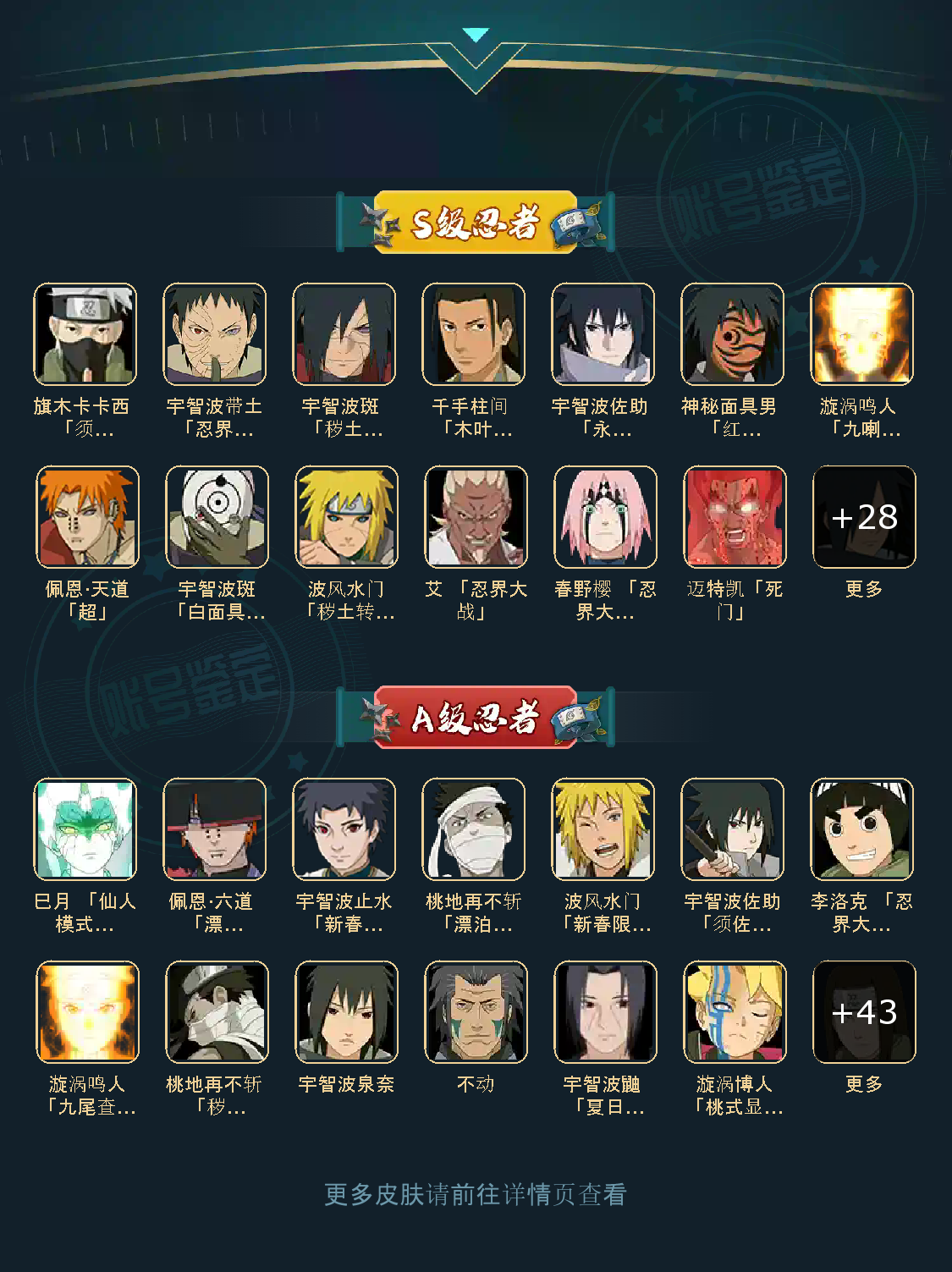 战力:1452W+;S忍37个;A忍48个,通灵兽21个,S忍:大蛇丸波风水门九喇嘛鸣人永恒万花筒佐助忍战樱普通纲手百豪纲手死门凯普通自来也豪杰自来也秽土水门猿飞日斩秽土猿飞千手扉间秽土扉间千手柱间秽土柱间木叶创立柱间秽土斑木叶创立斑秽土解