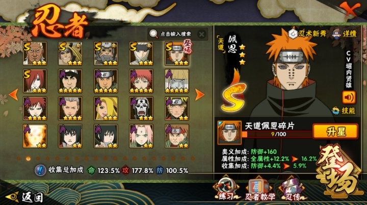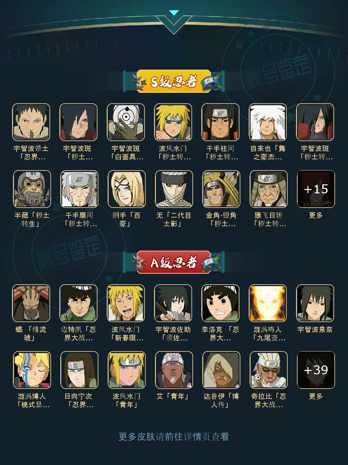 战力:1113W+;S忍26个;A忍45个,通灵兽20个,S忍:大蛇丸波风水门普通自来也豪杰自来也百豪纲手普通纲手秽土水门猿飞日斩秽土猿飞千手扉间秽土扉间千手柱间秽土柱间秽土斑宇智波斑须佐鼬神秘面具男白面具忍战带土鬼灯幻月四代艾金角银角二代