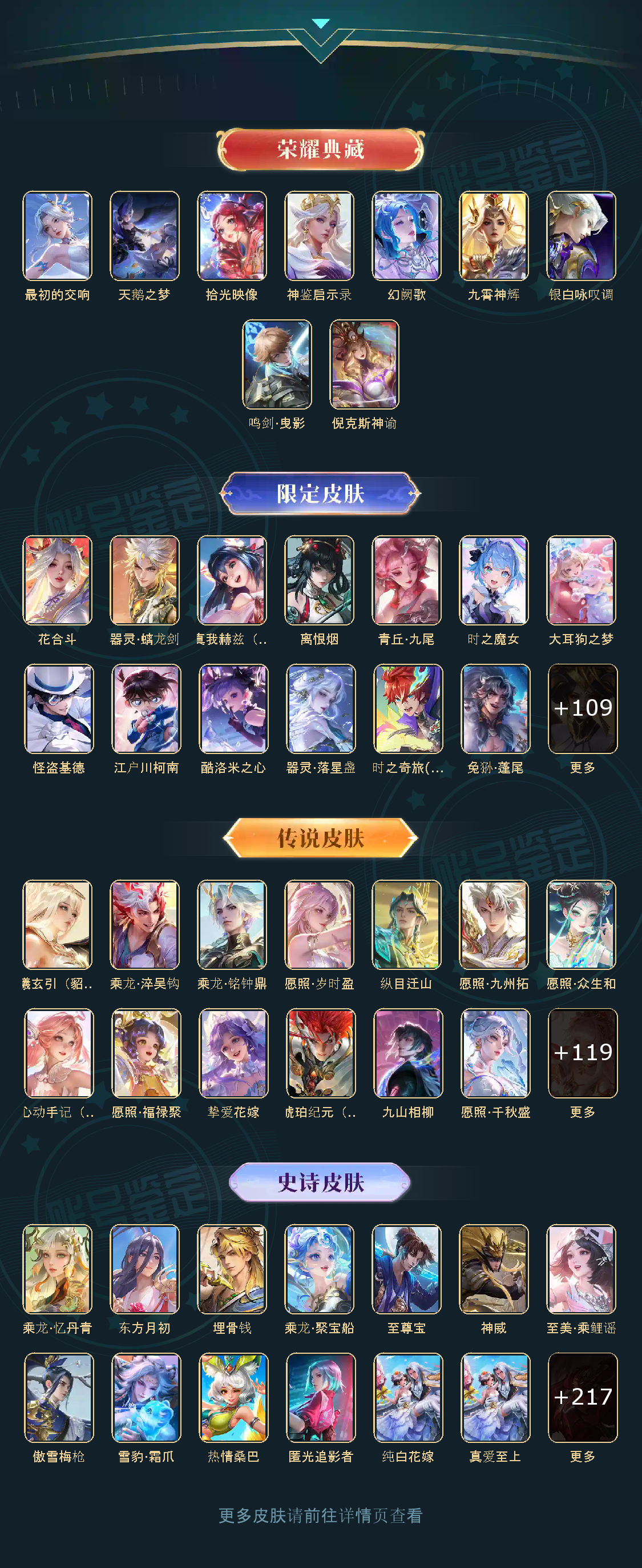 贵族等级V10无双贵族,英雄数量124,典藏皮肤数8,皮肤数量681,冰锋战神/街头霸王/天鹅之梦/纯白花嫁/天魔缭乱/至尊宝/真爱至上/凤求凰/热情桑巴/逐梦之影/武陵仙君/黄金狮子座/一生所爱/冰霜恋舞曲/青龙志/白虎志/朱雀志/太华/久胜战神/飞衡/梁祝/倪克斯神谕/白鹤梁神女/匿光追影者/鸣剑·曳影/遇见胡旋/龙胆/李逍遥/武圣/奔雷神使/孙行者/玉兔公主/补天/异界灵契/神威/启示之音/傲雪梅枪/淬星耀世/时雨天司