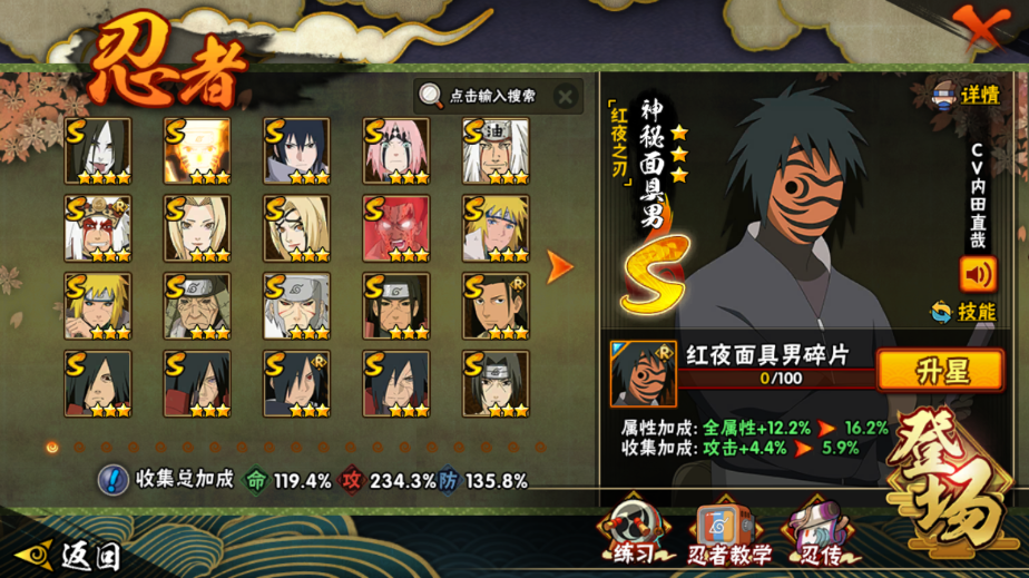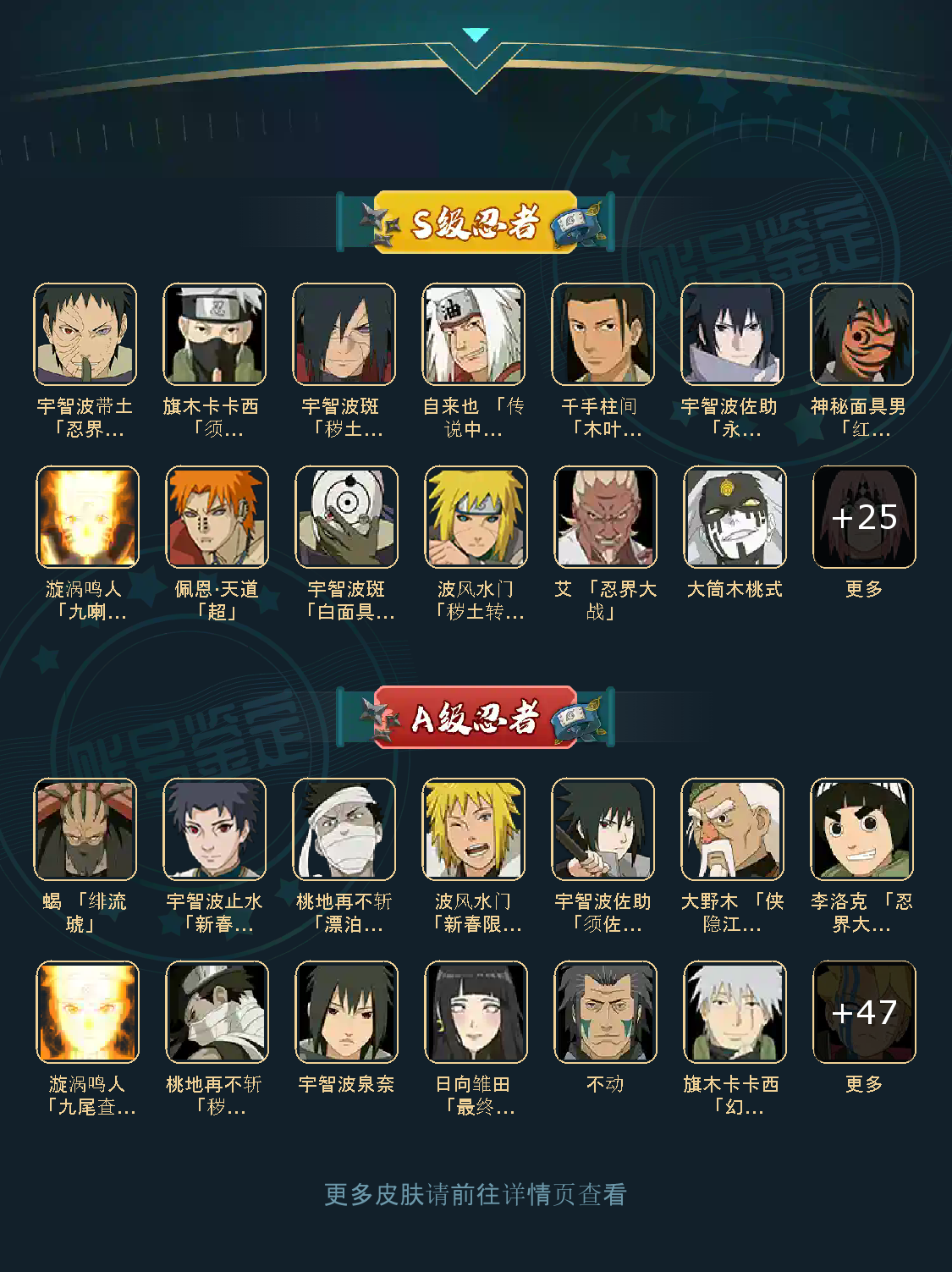 S忍36个;A忍54个,通灵兽19个,S忍:大蛇丸九喇嘛鸣人永恒万花筒佐助忍战樱普通自来也普通纲手百豪纲手死门凯波风水门豪杰自来也秽土水门秽土猿飞秽土扉间秽土柱间木叶创立柱间宇智波斑秽土斑木叶创立斑秽土解斑须佐鼬秽土鼬神秘面具男白面具忍战带土红夜面具男罗砂鬼灯幻月三代艾秽土半藏二代土影无天道超仙人兜大筒木桃式大筒木金式;A忍:猿飞阿斯玛疾风我爱罗迈特凯干柿鬼鲛蝎飞段忍战宁次死段青年水门日向雏田最终章七夕阿斯玛志村团藏鹰小队佐助须佐佐助宇智波止水千代十人卫百豪小樱秽土阿斯玛九尾鸣人幻之真容旗木卡卡西神威卡卡西新春水门忍战我爱罗新春止水忍战丁次仙人鸣人泳装照美冥奇拉比青年艾青年长门角都地怨虞晓大蛇新春鼬五代水影照美冥忍战奇拉比小南角都武士再不斩漂泊小南宇智波鼬迪达拉武士扉间不缘绝药师兜泳装小南博人猿飞暴怒带土加藤断博人达鲁伊秽土迪达拉黑土桃式显现博人六代水影长十郎;通灵兽:忍犬(普通)蓝蛇蛤蟆吉忍龟山椒鱼镰鼬猿魔蜃蛤蟆仙人鲛鲨蛤蟆健蛞蝓(普通)砂之守鹤乌鸦(普通)蛤蟆龙蛤蟆广梦貘蜘蛛鹰时装:百战波风水门百战大蛇丸蜀面豪杰舞之豪杰自来也