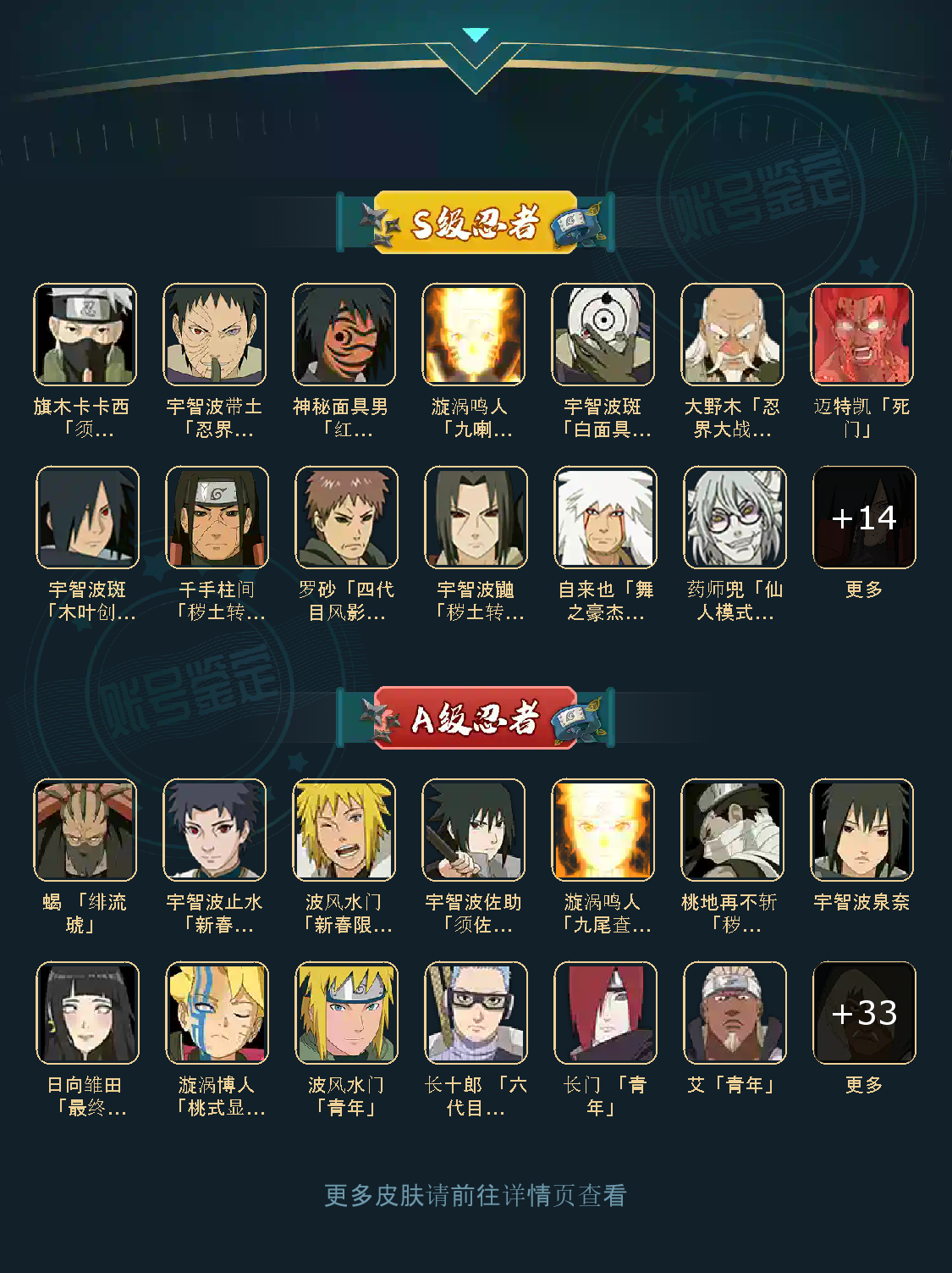 战力:1041W;VIP12级;S忍23个;A忍37个; 4430金币 15高招券 23s 6点券a 37a 1稀有时装 1个98通灵兽 四星纲手 四星猿飞日斩 漩涡鸣人(九喇嘛连结) 自来也(仙人模式) 迈特凯(死门) 猿飞日斩(秽土转生) 千手扉间(秽土转生) 千手柱间(秽土转生) 宇智波斑(秽土转生) 宇智波斑(木叶创立) 宇智波鼬(秽土转生) 宇智波斑(白面具) 宇智波带土(忍界大战) 神秘面具男(红夜之刃) 罗砂(四代目风影) 艾(三代目雷影) 大野木(忍界大战) 半藏(秽土转生) 长门(秽土转生) 药师兜(仙人模式) 波风水门 大蛇丸 自来也(舞之豪杰) 干柿鬼鲛(狂野鲛鲨) 宇智波带土(暴怒) 神秘面具男(忍者之路) 猿飞阿斯玛(七夕限定) 宇智波止水(新春限定) 波风水门(新春限定) 小南(夏日泳装) 波风水门(青年) 长十郎(六代目水影) 宇智波佐助(须佐能乎) 长门(青年) 艾(青年) 达鲁伊(五代目雷影) 熊猫通灵兽