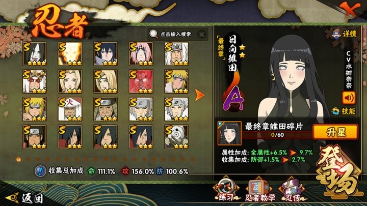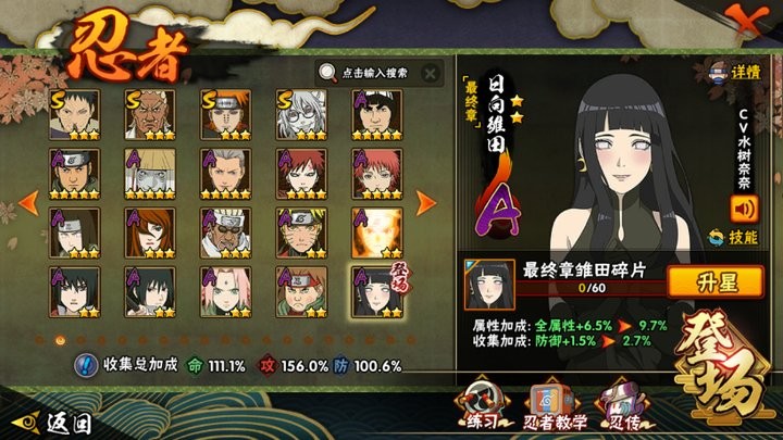 战力:1156W+;VIP7级;S忍24个;A忍38个,通灵兽16个,S忍:大蛇丸九喇嘛鸣人永恒万花筒佐助忍战樱普通自来也普通纲手百豪纲手死门凯波风水门豪杰自来也秽土水门猿飞日斩秽土猿飞千手扉间秽土扉间秽土柱间宇智波斑秽土斑秽土解斑白面具忍