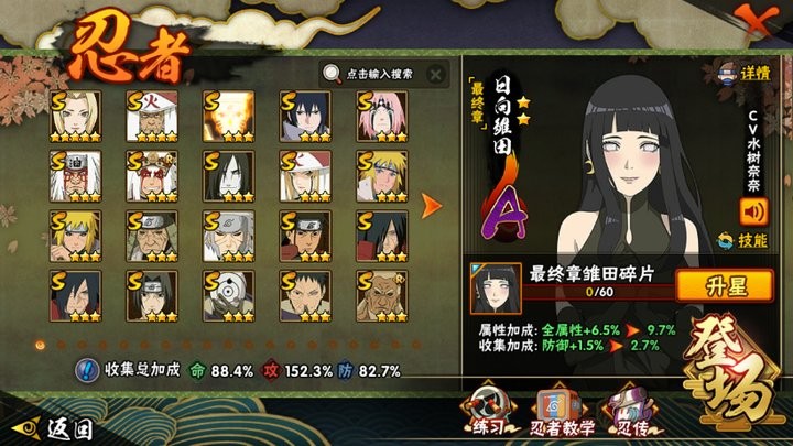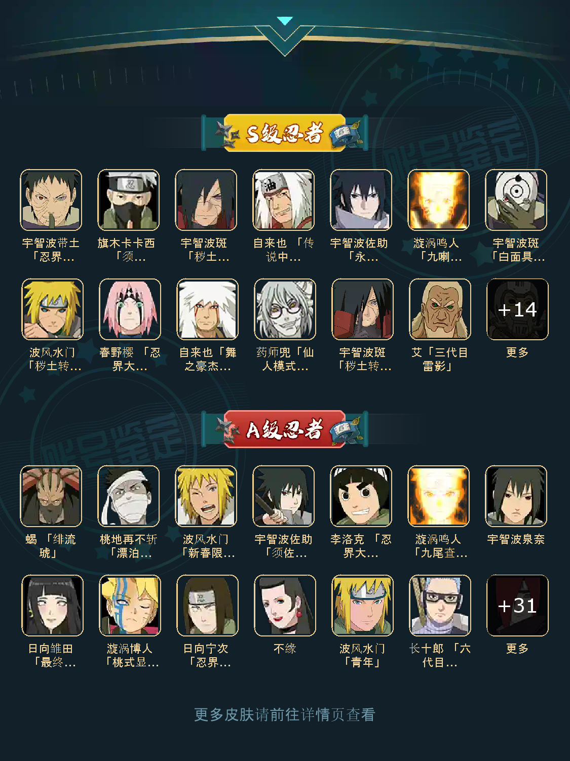 战力:1360W+;VIP12级;S忍24个;A忍37个,通灵兽19个,S忍:普通纲手猿飞日斩九喇嘛鸣人永恒万花筒佐助忍战樱仙人自来也大蛇丸百豪纲手波风水门豪杰自来也秽土水门秽土猿飞秽土扉间千手柱间秽土斑秽土解斑须佐鼬白面具忍战带土三代艾二