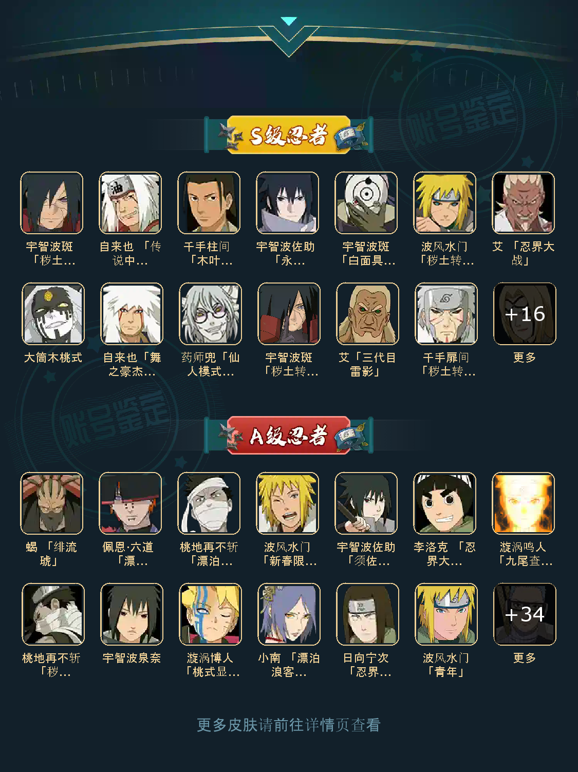 战力:1174W+;VIP12级;S忍24个;A忍39个,通灵兽21个,S忍:永恒万花筒佐助普通自来也大蛇丸百豪纲手普通纲手波风水门秽土水门猿飞日斩秽土猿飞秽土扉间千手柱间木叶创立柱间秽土斑宇智波斑秽土解斑须佐鼬神秘面具男白面具鬼灯幻月三代