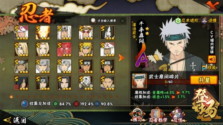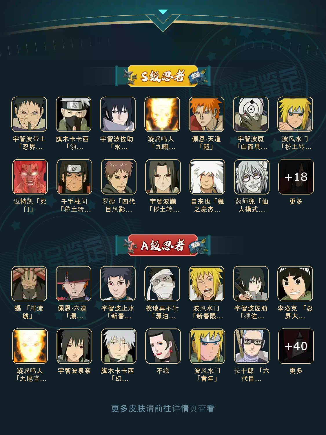 战力:1220W+;VIP13级;S忍27个;A忍45个,通灵兽20个,S忍:白面具仙人兜秽土扉间秽土斑秽土水门豪杰自来也秽土鼬天道超须佐鼬秽土长门千手扉间千手柱间波风水门普通纲手普通自来也大蛇丸金角银角鬼灯幻月猿飞日斩秽土猿飞二代土影无百