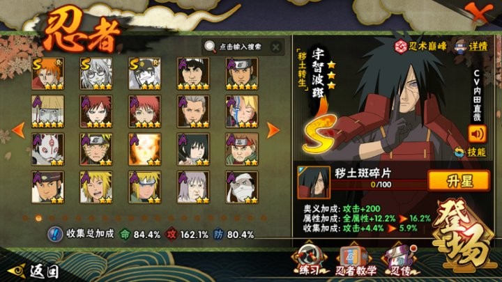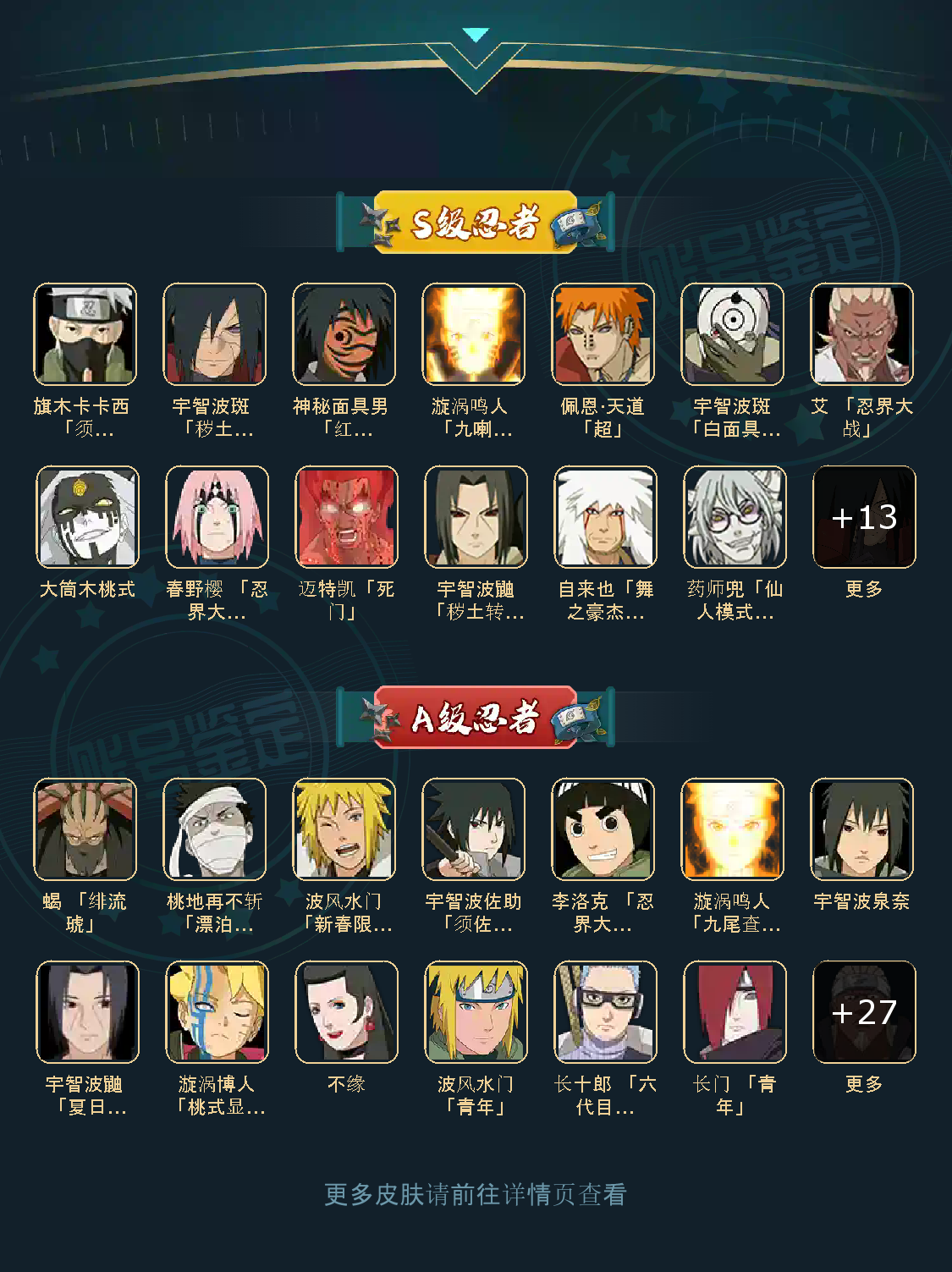 战力:1019W+;VIP13级;S忍23个;A忍35个,通灵兽21个,S忍:普通纲手猿飞日斩九喇嘛鸣人忍战樱仙人自来也大蛇丸死门凯波风水门秽土扉间豪杰自来也秽土斑秽土解斑须佐鼬秽土鼬神秘面具男白面具红夜面具男三代艾秽土半藏二代土影无天道超
