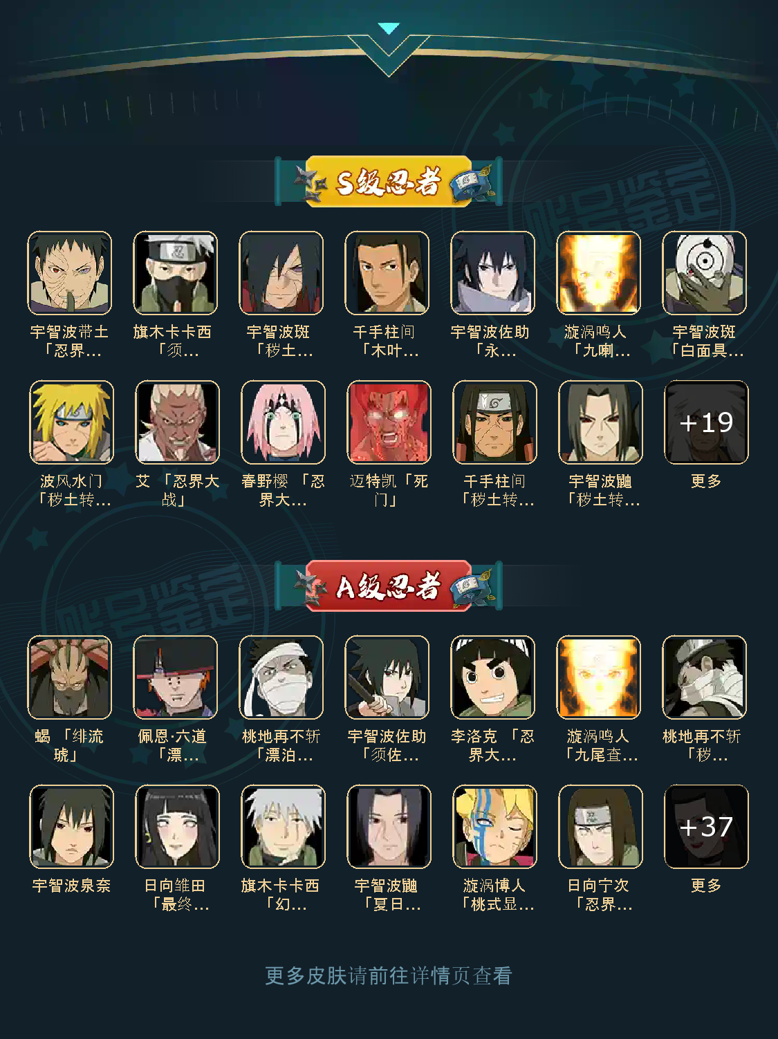 战力:1527W+;VIP11级;S忍30个;A忍44个,通灵兽21个,S忍:普通纲手猿飞日斩大蛇丸九喇嘛鸣人永恒万花筒佐助忍战樱仙人自来也百豪纲手普通自来也豪杰自来也死门凯波风水门秽土水门秽土猿飞秽土扉间木叶创立柱间秽土柱间秽土斑秽土解斑