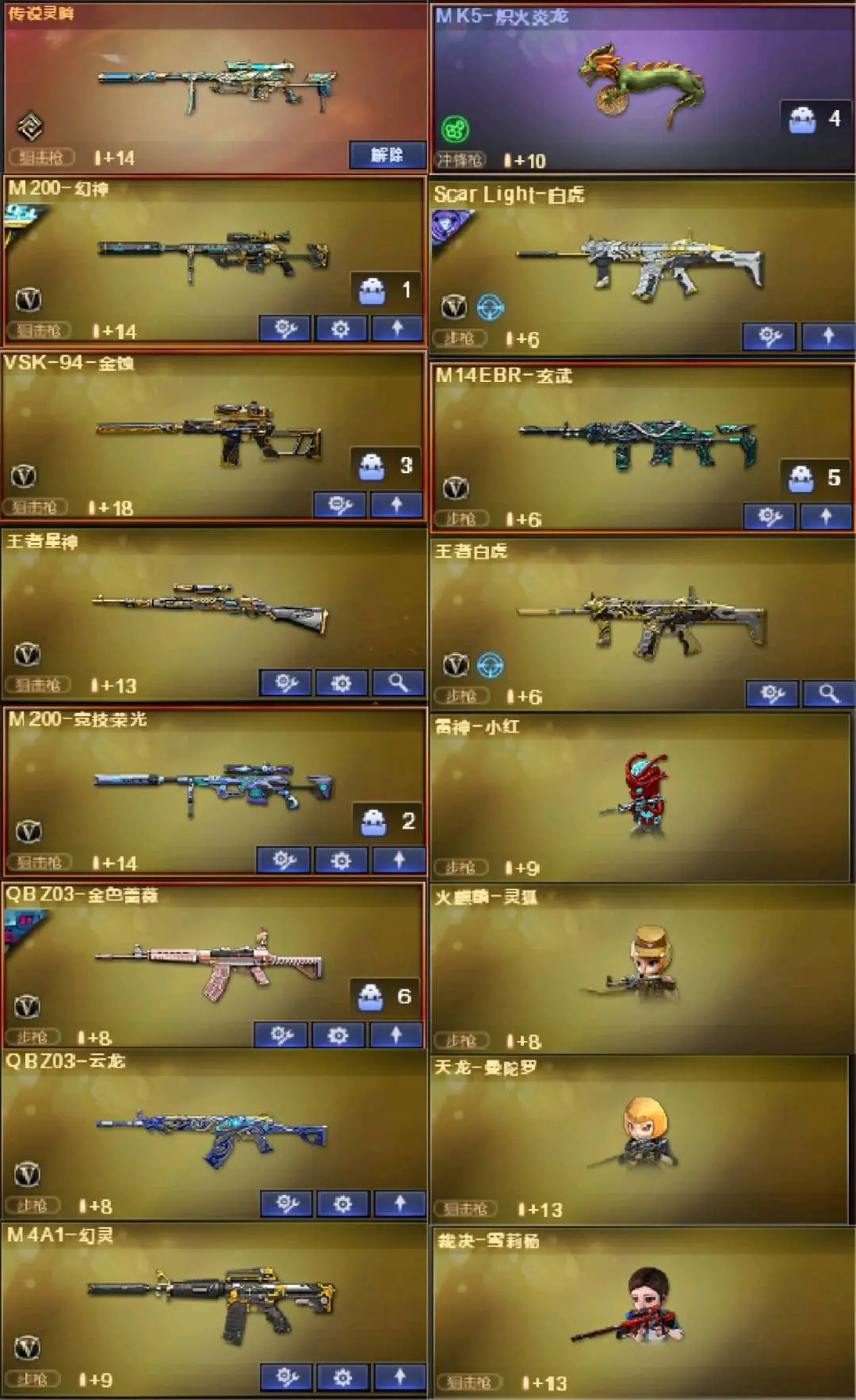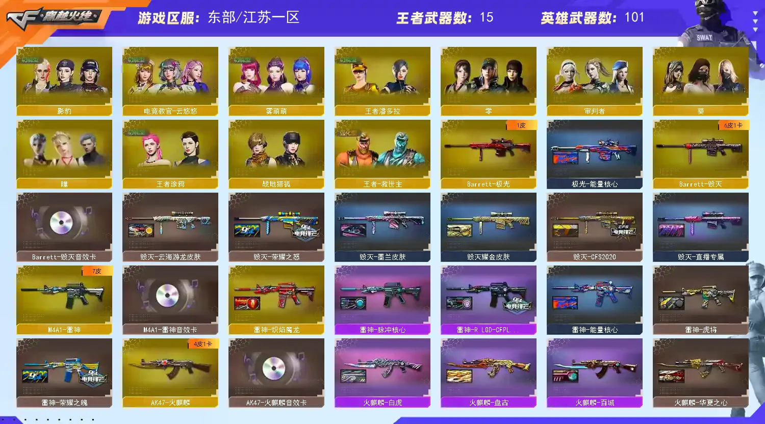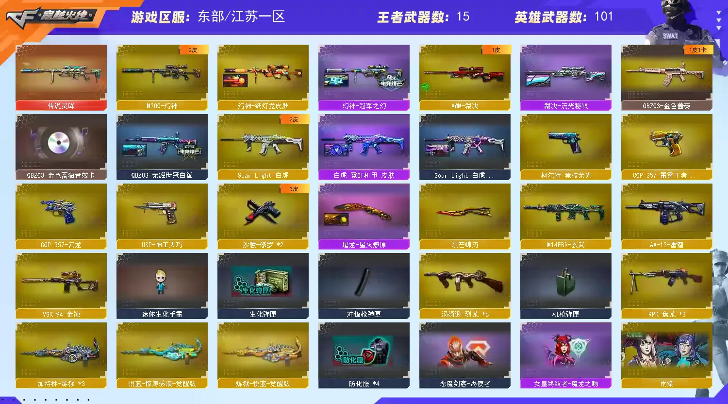多四防角色:云悠悠☆审判者☆王者涂鸦+雾萌萌☆传说灵眸+幻神双皮(冠军之幻+纸灯龙)qbz三件套(荣耀白鲨)☆竞技荣光套☆幻灵套☆白虎双皮+王者白虎+玄武☆炽芒蝶刃☆qbz云龙☆多小人枪MK5炽火炎龙☆屠龙(星火燎原皮)☆cop×3(雷霆+云龙+白鲨)+usp神工天巧+柯尔特·赛博朋克☆3盘龙7炼狱6盘龙+死亡之眼☆音效卡(qbz+雷神+毁灭+火麒麟)等等,每把武器都带有皮肤!还有很多皮肤就不一一描述了,具体可以看图!