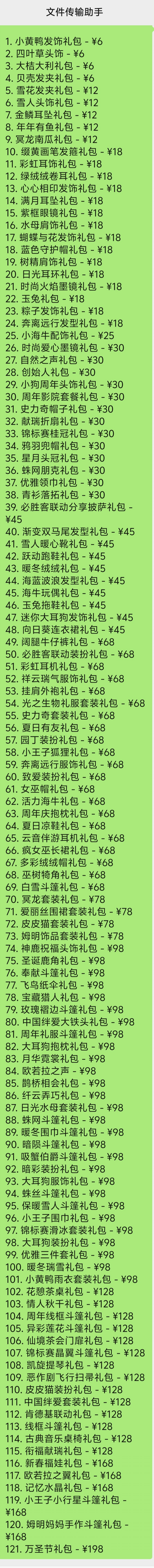 双人坐骑 马面裙 幸运眼镜 宝骏丹心马尾 晶翼斗篷 滑冰套装 紫框眼镜 小狗耳 护士帽 蝴蝶结画笔 音乐耳机 堆堆袜 围巾斗 雪人头饰 猫耳套装 鸦羽兜帽 纤云弄巧 日光水母套装 记忆水晶 鹊桥相会 光之生物礼服 冥龙角套装 燕尾斗篷 海牛角和尾巴 小黄鸭斗篷鞋 小黄鸭 黑暗斗篷 蝴蝶与花 海牛配饰 青衫落拓 眼镜+爆米花 必胜客cdk/披萨/裙子 粽子发饰 玫瑰斗篷 围巾斗 狐狸 星球夹克 双马尾和爱心发饰 藏宝节裤子 扇子和斗篷 爱丽丝联动的裙子和螃蟹洞 妮妮斗篷 扫帚 姆明所有礼包 音乐桌 奔离服饰 挚爱 祥云裤 野餐裤 暗彩裤 披肩长袍 月华套装 牛仔裤 女巫裙 kfc套装 夏日裙子 水母 日光耳环 凉鞋 兔拖 毛靴 运动鞋 福娃 猫猫斗篷 kfc兑换码 星月头饰 九色鹿角 金鳞耳坠 彩虹耳钉 彩虹耳机 满月耳环 爱心眼镜 火焰眼镜 枯角 鹿角 领结 向日葵帽子 奔离发型 海洋发型 彩虹帽 蝙蝠 巫师 朋克头 绊爱 大耳狗发饰 橘子兔子雪花锦鲤四叶草 小狗头饰 桂冠 大耳狗头饰 创始人 欧若拉之翼 臣服斗篷 莲花斗 线条斗篷 蛛丝 蛛网 伯爵斗篷 瑞雪 白绒 雪袄 大耳狗斗篷 欧若拉之声 小提琴 飞鸟伞 双人茶桌 南瓜 海螺 奥利奥 大耳狗背饰 大铁头 秋千