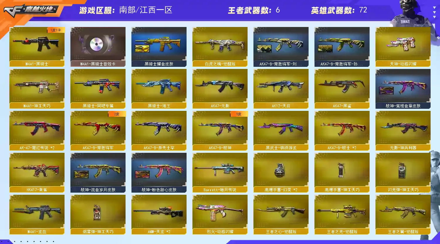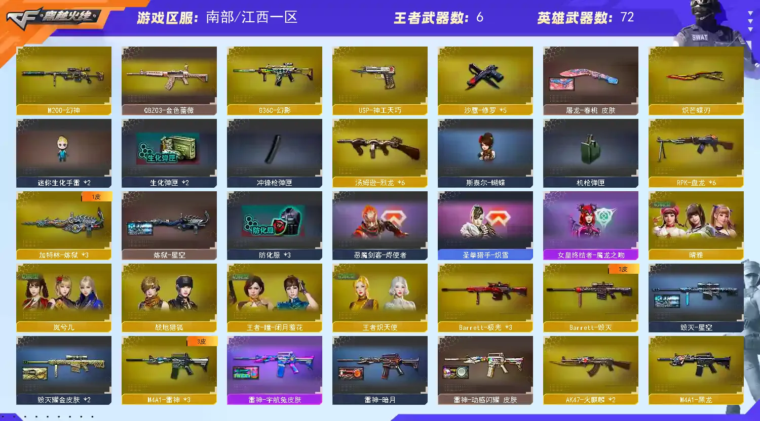 6盘6烈 蝴蝶刀 蝴蝶枪 3王者 2炫金 毁灭星空/毁灭耀金/雷神动感闪耀 /雷神宇航兔/雷神暗月/黑骑士娜塔莉娅 /黑骑士耀金/火麒麟CFSTAR/刘备/孙权/_岚兮儿/_晴雅/M200-幻神/Barrett-毁灭/Barrett-极光(3)/Barrett-暗月传说/王者之光-觉醒版/M4A1-黑骑士音效卡