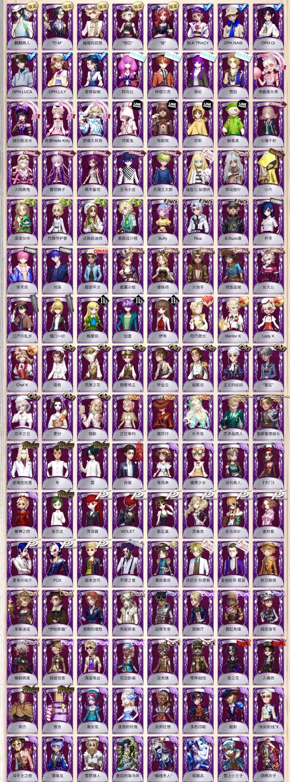 ❤️新增红夫人-艾琳艾德勒 红蝶-胧夜 幻灯师-于此岸赴宴 勘探员-璀璨的孤狼 观唐联动-钟阁杼思 囚徒二限-黎明赋格 气象学者-芙莉莲 骑士-辛美尔 祭司-阿乌拉 心理学家-菲伦 病患-休塔尔克 玩具商-认知启迪师 医生-银锑 调酒二限-破碎的芙拉吉尔 LineFriend联动全皮 小女孩-石榴碟小姐 气象学家-茶歇小姐 拉拉队员-oph电竞套 心理学家金皮-恒梦 病患金皮-溯光 弓箭手金皮-不合时宜的危鲁弗 昆虫学者冠军紫皮-踏莎行