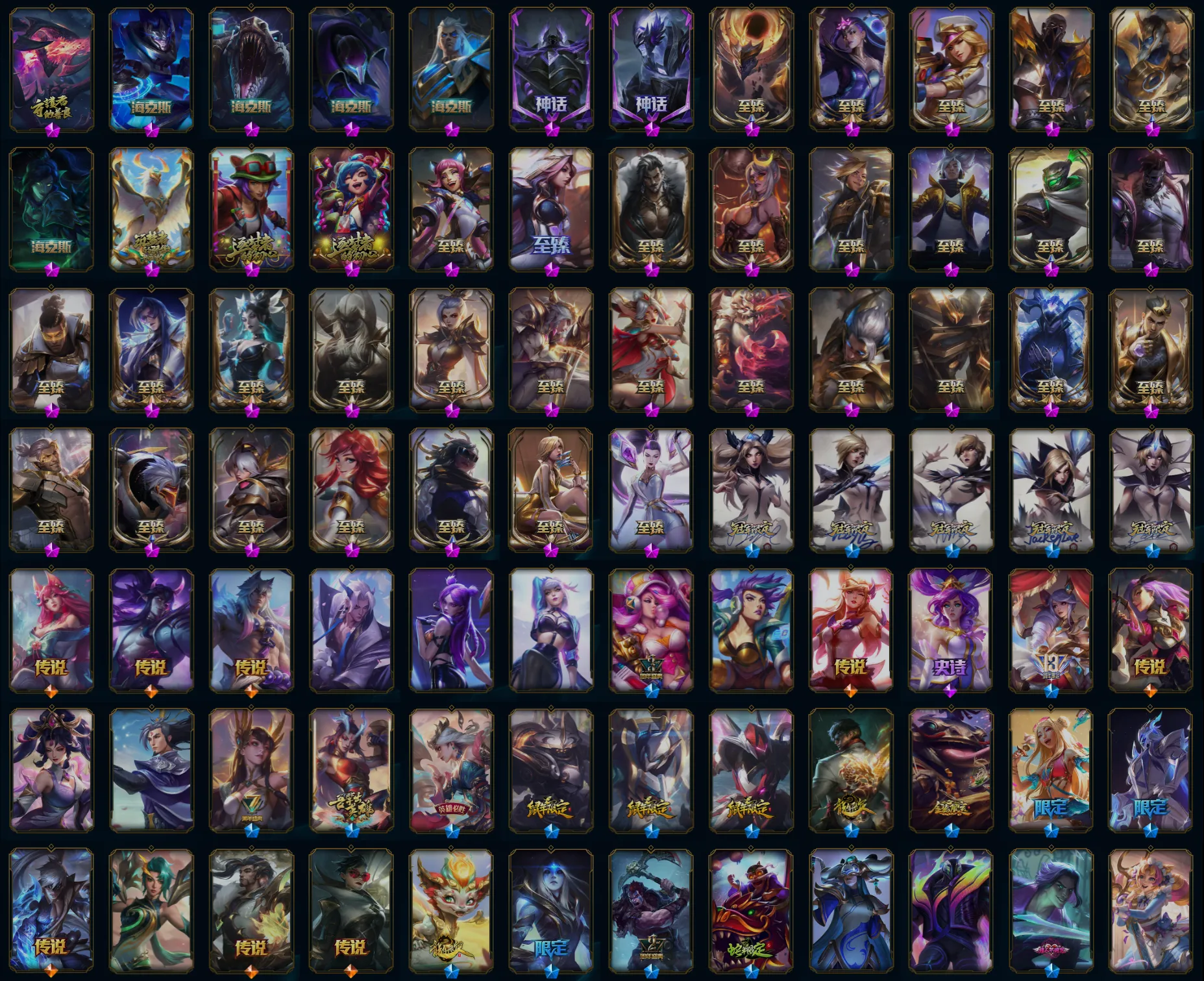 【传说皮肤】黯黑魔龙希瓦娜 黯晶凤凰艾尼维亚 暗星锤石 暗星女王拉克丝 暗星尊烬 奥德赛凯隐 霸天零式赛恩 霸天异形卡兹克 冰霜之刃艾瑞莉娅 苍穹之光韦鲁斯 电玩女神娑娜 第三类接触黑默丁格 地狱之门卫士加里奥 恶魔之刃泰达米尔 符文战熊沃利贝尔 钢铁军团盖伦 钢铁之翼凯尔 光明哨兵格雷福斯 光明哨兵薇恩 灌篮高手德莱厄斯 鬼魂新娘莫甘娜 黑夜使者索拉卡 黑夜使者亚索 合金巨兽努努和威朗普 红色男爵库奇 金牌主播德莱文 枯萎之壤泽拉斯 炼狱魔犬内瑟斯 烈焰雄心崔丝塔娜 黎明使者索拉卡 黎明使者永恩 灵魂莲华阿狸 灵魂莲华锤石 灵魂莲华瑟提 陆地王者4WD布里茨 律政大亨蒙多 女帝卡特琳娜 女皇艾希 女校长菲奥娜 女主播迦娜 青花瓷奥瑞利安索尔 日蚀骑士蕾欧娜 上古战魂魔腾 神龙尊者圣龙李青 神龙尊者昼日真龙亚索 神拳李青 神王德莱厄斯 神王盖伦 双重冰晶艾尼维亚 死亡骑士盖伦 天煞劫 铁哥们儿奥拉夫 提莫约德尔人的一大步 屠龙勇士潘森 未来战士凯特琳 西部魔影大小姐蕾欧娜 西部魔影卢锡安 西部魔影永恩 西部天使艾希 西部天使赛娜 邪鸦魅影乐芙兰 星之守护者阿狸 星之守护者金克丝 驯龙炮手崔丝塔娜 焰尾妖狐阿狸 泳池派对吉格斯 源计划超体莫德凯撒 源计划净化薇恩 源计划联合艾希 源计划泯灭雷克顿 约德尔国队长提莫 月蚀骑士蕾欧娜 宇航员诺提勒斯 战场女武神凯尔 战地机甲厄加特 战地巨兽科加斯 战斗学院伊泽瑞尔 最终BOSS维迦