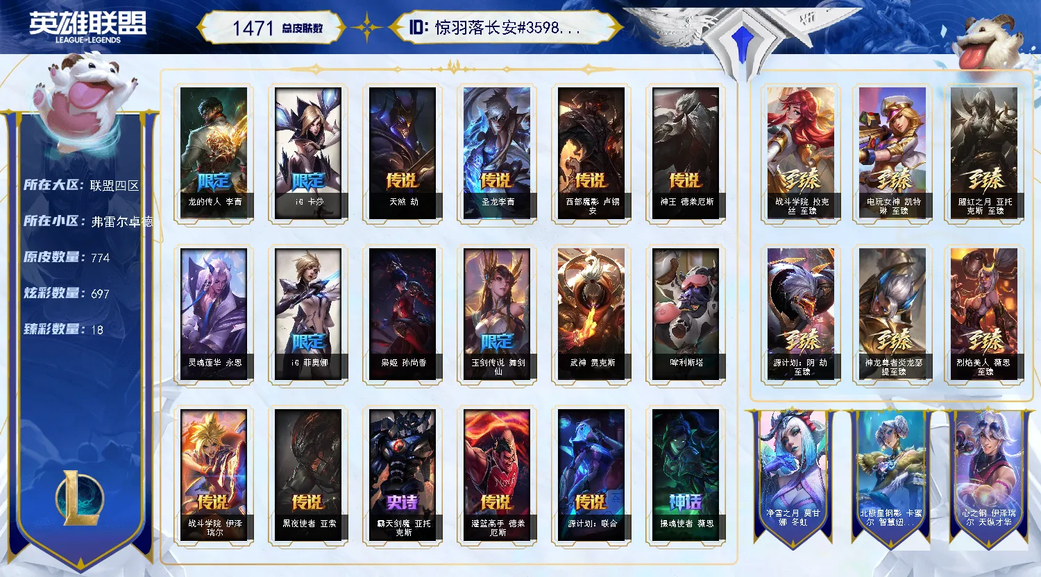 【重要皮肤】狼神英灵斯维因至臻 暗星女王黛安娜至臻 T1杰斯至臻 心之钢永恩至臻 斗魂觉醒派克至臻 DRX亚托克斯至臻 绝息圣堂厄运小姐至臻 至高天奎桑提至臻 星之守护者辛德拉至臻 幻灵战斗猫金克丝至臻 神凰行者烈羽焰凰霞至臻 女帝黛安娜至臻 未来战士卢锡安至臻 真实伤害亚索至臻 真实伤害赛娜至臻 灵能特工伊泽瑞尔至臻 源计划逆流塞拉斯至臻 源计划阴劫至臻 王国机神玄武盖伦至臻 暗星墨菲特至臻 神龙尊者炎龙瑟提至臻 神龙尊者均衡之龙沃利贝尔至臻 征服者贾克斯至臻 飞升战神潘森至臻 KDA二代卡莎至臻 KDA伊芙琳至臻 战斗学院拉克丝至臻 烈焰美人薇恩至臻 电玩女神凯特琳至臻 源计划正义艾瑞莉娅至臻 玉剑传说武剑仙至臻 腥红之月亚托克斯至臻 灰烬骑士莫德凯撒 灰烬杀手塞拉斯 海克斯科技安妮 海克斯科技雷克顿 海克斯科技斯维因 海克斯科技波比 海克斯科技嘉文四世 海克斯科技魔腾 永恒之森奥恩 暗星科加斯 摄魂使者薇恩 胜利女神娑娜 胜利之王泰达米尔 荣誉使者玛尔扎哈 勇敢的心德莱厄斯 电玩女神厄运小姐 玉剑传说舞剑仙 女帝格温 玉剑传说舞龙卫 玉剑传说翼剑仙 龙的传人李青 天龙之子斯莫德 虎头虎脑崔丝塔娜 龙腾虎跃瑟提 招财进宝提莫 南天之怒沃里克 纳财大帝塔姆 神龙之翼库奇 王国机神朱雀蕾欧娜 王国机神苍狼瑟提 王国机神白虎贾克斯 胜利女神瑟庄妮 胜利机器人布里茨 胜利枪神卢锡安 胜利之剑亚托克斯 甜心宝贝安妮 觅心魔灵奥莉安娜 觅心女王艾希 幽梦玫瑰泰隆 双城之战2微光实验室辛吉德 冰封王子蒙多 魄罗骑士瑟庄妮 平安夜女神娑娜 魅惑女巫奈德丽 死亡誓约维克托 克烈古拉伯爵 勇敢的心德莱厄斯 海之歌艾希 海之歌萨勒芬妮 海之歌永恩 泳池派对普朗克 泳池派对辛德拉 泳池派对塔莉垭 泳池派对厄运小姐 泳池派对塔里克 泳池派对格雷福斯 泳池派对李青 泳池派对雷克顿 泳池派对瑟提 御星魔矢艾希 DRX亚托克斯 DRX阿卡丽 DWG烬 iG卡蜜尔 iG洛 iG卡莎 iG艾瑞莉娅 iG乐芙兰 iG菲奥娜 SSG塔莉垭 SKTT1烬 SKTT1艾克 SKTT1雷克顿 SSW锤石 SSW泰隆 SSW图奇 SSW辛吉德 暗杀星蒙多 暗杀星努努和威朗普 暗杀星伊泽瑞尔 暗杀星慎 Fnatic迦娜 Fnatic古拉加斯 Fnatic嘉文四世 Fnatic卡尔萨斯 冰雪节辛吉德 防暴机器人布里茨 防暴士兵格雷福斯 防暴士兵辛吉德 防暴天使凯尔 冠军掠夺者卡兹克 冠军之矛卡莉丝塔 冠军之刃锐雯2016 冠军之血希瓦娜 冠军之隐劫 春晖大帝锤石 鬼影森森茂凯 鬼影重重魔腾 海贼瑞兹 胡桃夹子萨科 惊悚派对阿木木 蓝色忧郁崔斯特 南瓜头费德提克 圣诞精灵崔丝塔娜 圣诞开心鬼提莫 圣诞狂欢努努和威朗普 圣诞老人古拉加斯 圣诞玩偶波比 圣诞驯鹿克格莫 无头骑士赫卡里姆 喜庆之树茂凯 邪恶圣诞老人维迦 幸福女神乐芙兰 雪默丁格 征服者卡尔玛 暗影沃里克 阿木木主人不要我了 2023全球总决赛雷克顿 波比的巧克力工坊 都铎王朝图奇 十五周年纪念希维尔 十周年纪念安妮 神凰行者瑞羽圣凰艾尼维亚 胜利凤凰艾尼维亚 灵魂守卫乌迪尔 绝息圣堂洛