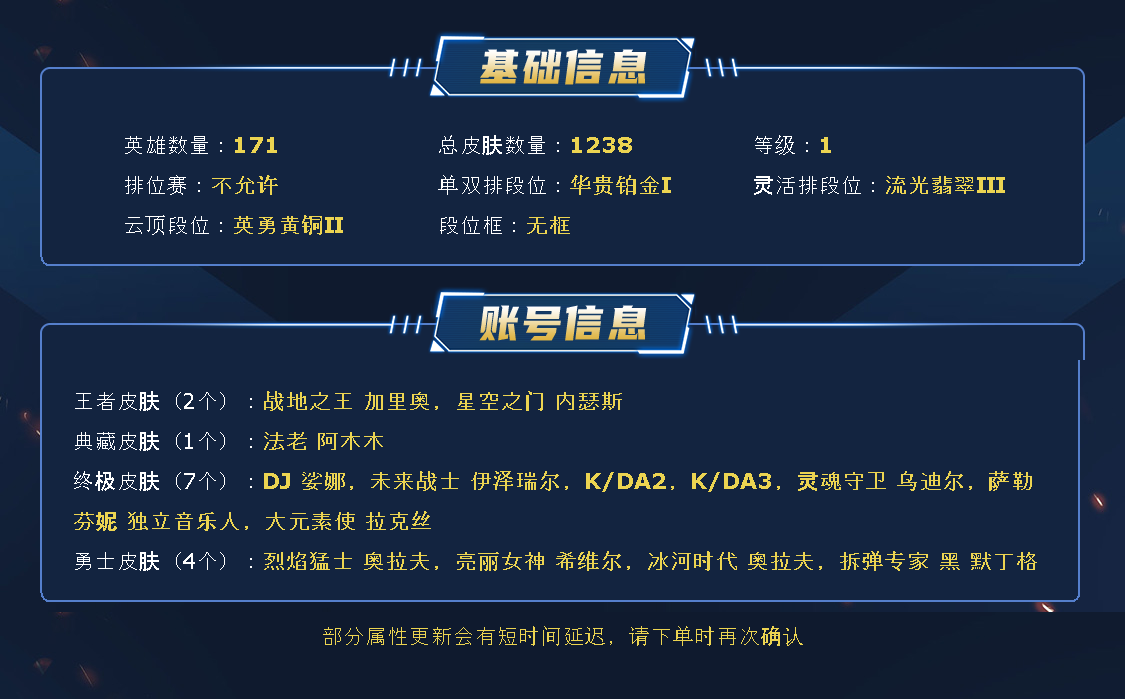 ~~喜欢记得收藏~~可排位~~1300皮全英雄~~租之前尽量查一下游戏ID,确保段位是您需要的,避免浪费您的时间~~请勿挂机逃跑故意送人头,谢谢合作,谢谢~~