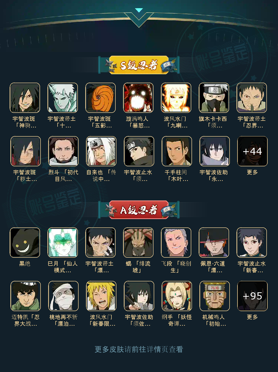 S级忍者(52个):,波风水门「九喇嘛连结」,自来也,舍人,旗木卡卡西「须佐能乎」,宇智波止水「须佐能乎」,艾「忍界大战」.大筒木桃式,宇智波斑「秽土转生•解」,千手柱间「木叶创立」,宇智波佐助「永恒万花筒」,神秘面具男「红夜之刃」,春野樱「忍界大战」,大简木金式「博人传」,流涡鸣人「九喇嘛连结」,三代目风影「秽士转生」,大野木「忍界大战」,迈特凯「死门」,宇智波斑「木叶创立」,宇智波带士「忍界大战」,千手柱间「秽士转生」,罗砂「四代目风影」,宇智波鼬「秽士转生」,自来也「舞之豪杰」,佩恩•天道「超」,药师兜「仙人模式」,宇智波斑「秽士转生」,艾「三代目雷影」,宇智波斑「白面具」,半藏「秽士转生」,千手扉间「秽士转生」,纲手「百豪」,无「二代目士影」,波风水门『秽士转生」,金角•银角「秽士转生」,猿飞日斩「秽土转生」,长门「秽士转生」,宇智波斑,千手柱间,艾「四代目雷影」,千手扉间,神秘面具男,鬼灯幻月「二代目水影」,佩恩「天道」,大蛇丸,波风水门,纲手,自来也,宇智波鼬「须佐能乎」,大野木「三代目士影」,自来也「仙人模式」,猿飞日斩