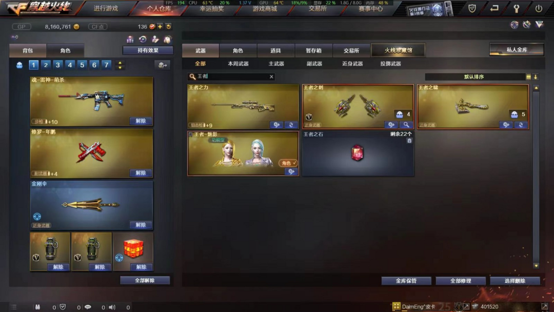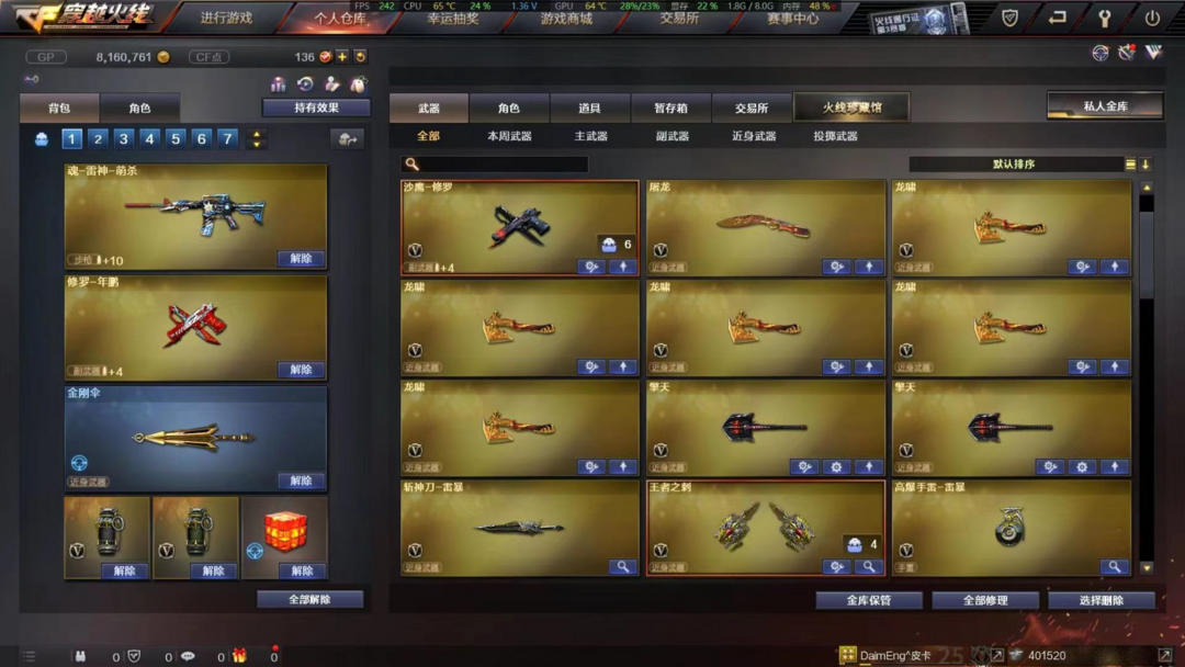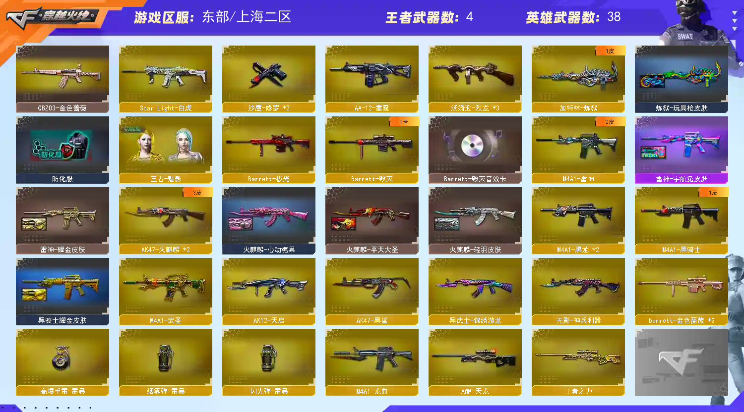 本游戏账号:英雄武器36个; 王者武器3个。 装备不多,但是主武器、副武器、近身武器够用 拥有完美游戏体验。重要的是,特殊装备有:加特林-炼狱、AK47-火麒麟、王者之力、王者之啸、王者-魅影、堕天使、炼狱-悦蓝金色光效、等,随意畅选。