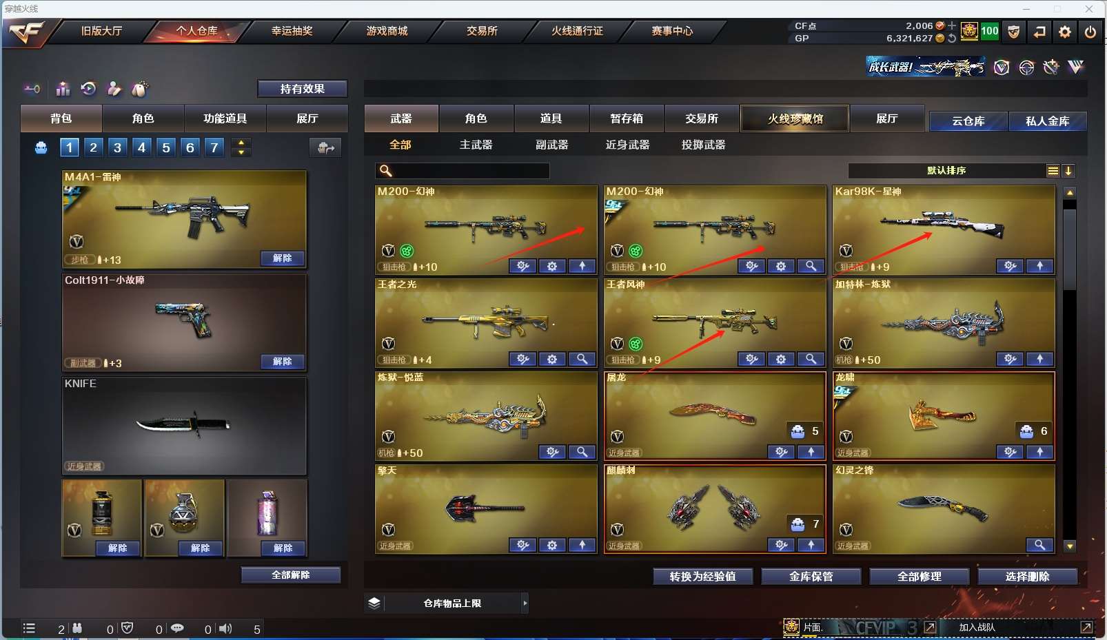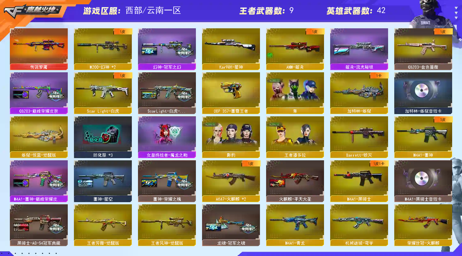 【王者风神】 【m200幻神+冠军之幻】 【98k星神】 【传说梦魇】 【白虎+冠军之虎】 【王者芳薇】 【qbz金色蔷薇+巅峰荣耀】 【荣耀世冠火麒麟】 【火麒麟】 【雷神+巅峰荣耀+荣耀之魄】 【黑骑士+音效卡+s4冠军】 【毁灭】 【裁决】 【炼狱+音效卡】 【青龙】 【屠龙 龙啸 擎天 麒麟刺】 【四防角色 王者潘多拉 隼 职业经理】 【角色 影豹 云海玲珑】 【云海游龙炫彩背包】