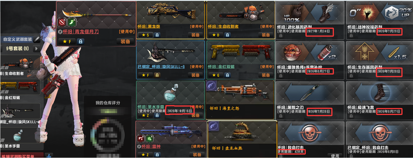 3.更新:怀旧雷神,天巡1,2,怀旧三件套黑龙炮,斧头,金红双蝎!可打主播房!从1到21赛季都有且无分解(缺不重要的18赛季,第15赛季为期限);光束全套123,维京全套联动卡丽,闪电94和野牛联动十五!强化武器全满,配件武器全6阶!已去黑雾!