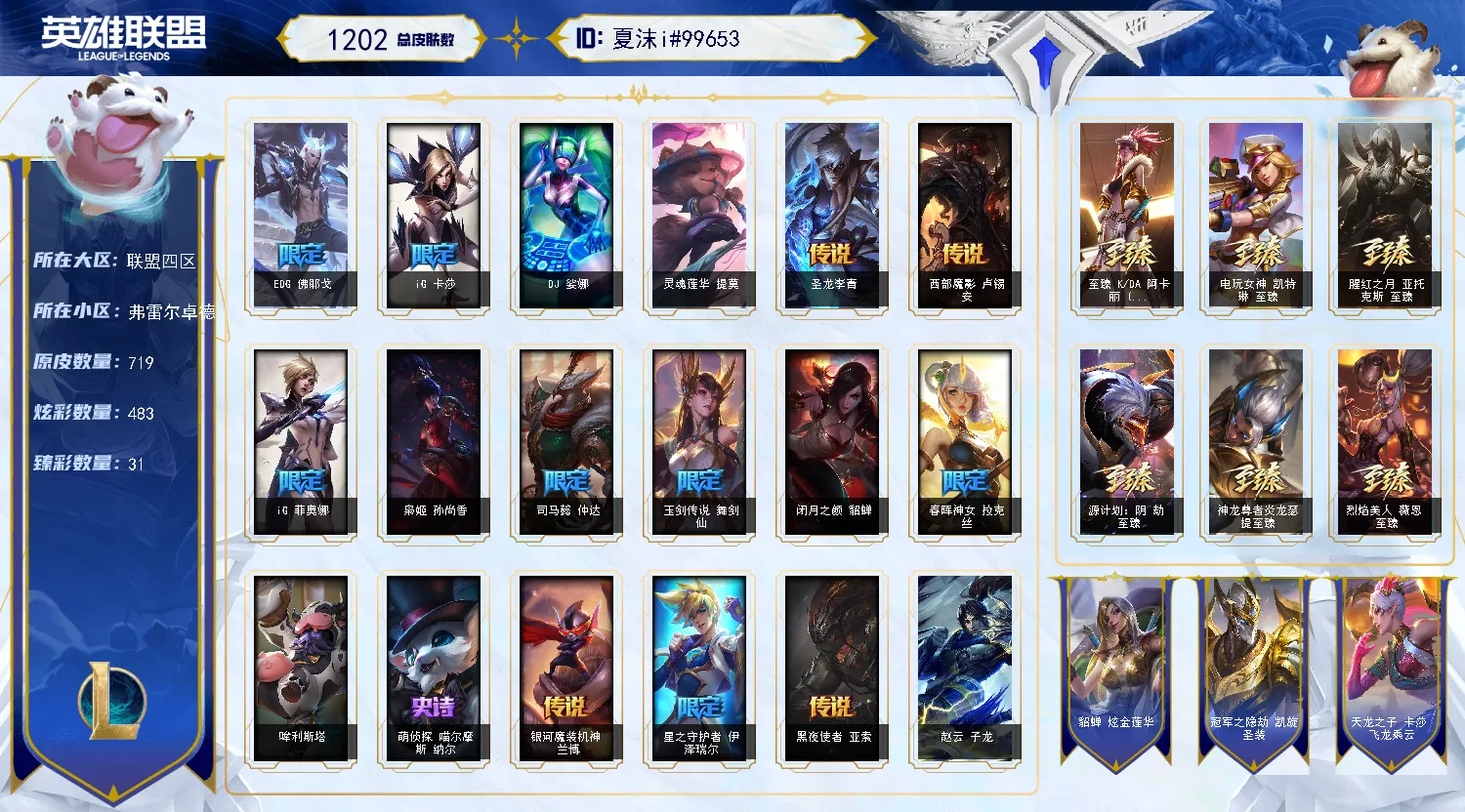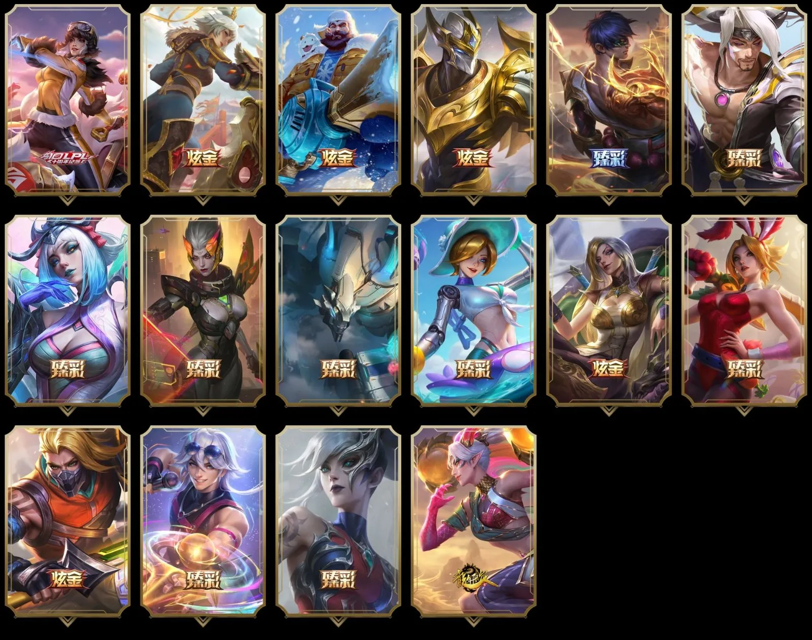 【重要皮肤】北极星使者沃里克至臻 至高天奎桑提至臻 海之歌萨勒芬妮至臻 西部魔影猎天使恶魔泰隆至臻 幻灵战斗猫金克丝至臻 神凰行者烈羽焰凰霞至臻 女帝黛安娜至臻 战斗学院蕾欧娜至臻 魔女婕拉至臻 魔女乐芙兰至臻 未来战士卢锡安至臻 真实伤害亚索至臻 真实伤害赛娜至臻 灵能特工伊泽瑞尔至臻 福牛守护者菲奥娜至臻 源计划逆流塞拉斯至臻 源计划阴劫至臻 王国机神玄武盖伦至臻 暗星墨菲特至臻 神龙尊者炎龙瑟提至臻 黑夜使者凯隐至臻 神龙尊者均衡之龙沃利贝尔至臻 飞升战神潘森至臻 KDA二代卡莎至臻 KDA一代卡莎至臻 KDA阿狸至臻 KDA阿狸2022至臻 KDA阿卡丽至臻 KDA阿卡丽2022至臻 烈焰美人薇恩至臻 烈焰美人薇恩2022至臻 电玩女神凯特琳至臻 电玩女神凯特琳2022至臻 源计划正义艾瑞莉娅至臻 源计划正义艾瑞莉娅2022至臻 绒毛菲兹至臻 玉剑传说武剑仙至臻 玉剑传说武剑仙2022至臻 腥红之月亚托克斯至臻 腥红之月亚托克斯2022至臻 未来战士锤石至臻 未来战士锤石2022至臻 黑夜使者李青至臻 黑夜使者李青2022至臻 灰烬骑士莫德凯撒 海克斯科技安妮 海克斯科技瑟庄妮 海克斯科技雷克顿 海克斯科技斯维因 海克斯科技吉格斯 海克斯科技嘉文四世 海克斯科技阿利斯塔 恐惧新星德莱厄斯 摄魂使者薇恩 新创战纪希维尔 荣誉使者玛尔扎哈 养蜂人辛吉德 勇敢的心德莱厄斯 电玩女神厄运小姐 电玩勇者锐雯 电玩女神阿狸 星之守护者伊泽瑞尔 玉剑传说舞剑仙 天龙之子斯莫德 替父从军花木兰 神龙烈焰金克丝 春晖神女拉克丝 你看见过我的熊猫吗安妮 虎痴之拳蔚 张辽文远 司马懿仲达 金猪烈焰瑟庄妮 烈焰美人薇恩 醒狮克格莫 神龙之翼库奇 王国机神青龙德莱文 王国机神苍狼瑟提 王国机神白虎贾克斯 胜利女神瑟庄妮 胜利之树茂凯 胜利机器人布里茨 胜利女神奥莉安娜 胜利枪神格雷福斯 胜利枪神卢锡安 胜利之剑亚托克斯 碎心之拳蔚 甜心之羽霞 甜心之翎洛 觅心游侠卢锡安 冬季仙境奥莉安娜 雪球也能爆炸吉格斯 圣诞捣蛋鬼金克丝 圣诞老人德莱文 冰雪风暴希维尔 冰雪女神辛德拉 魄罗骑士瑟庄妮 平安夜女神娑娜 圣诞糖果棒厄运小姐 死亡誓约卡特琳娜 勇敢的心德莱厄斯 泳池派对奥莉安娜 泳池派对塔莉垭 泳池派对格雷福斯 泳池派对蕾欧娜 泳池派对雷克顿 电玩战魂赫卡里姆 送披萨的小姐姐希维尔 鸡里奥 克格汪 EDG厄斐琉斯 EDG佛耶戈 EDG格雷福斯 EDG悠米 EDG佐伊 FPX锤石 FPX薇恩 FPX李青 FPX普朗克 FPX墨菲特 iG卡蜜尔 iG洛 iG卡莎 iG艾瑞莉娅 iG乐芙兰 iG菲奥娜 SSG洛 SKTT1扎克 SKTT1阿利斯塔 SKTT1瑞兹 SKTT1阿兹尔 SKTT1雷克顿 SSW锤石 SSW雷恩加尔 SSW辛吉德 SKTT1劫 SKTT1婕拉 SKTT1薇恩 暗杀星努努和威朗普 暗杀星伊泽瑞尔 Fnatic库奇 Fnatic古拉加斯 冰雪节格雷福斯 冰雪节辛吉德 防暴机器人布里茨 防暴士兵格雷福斯 防暴士兵辛吉德 防暴天使凯尔 钢铁之翼艾尼维亚 冠军典狱长锤石 冠军掠夺者卡兹克 冠军之矛卡莉丝塔 冠军之刃锐雯 冠军之血希瓦娜 冠军之隐劫 鬼影森森茂凯 鬼影重重魔腾 海贼瑞兹 惊悚派对阿木木 蒙多蒙多 破空枪骑孙悟空 圣诞精灵崔丝塔娜 圣诞开心鬼提莫 圣诞狂欢基兰 圣诞老人古拉加斯 圣诞驯鹿克格莫 外星装甲库奇 喜庆之树茂凯 邪恶圣诞老人维迦 幸福女神乐芙兰 雪默丁格 雪球也能爆炸吉格斯 雪装奈德丽 野兽猎人德莱文 英勇玩具兵普朗克 勇者奈德丽 征服者阿利斯塔 征服者卡尔玛 暗影沃里克 机械迷城加里奥 波比的巧克力工坊 地底世界崔斯特 都铎王朝图奇 十五周年纪念希维尔 十周年纪念安妮 源代码乐芙兰 神凰行者瑞羽圣凰艾尼维亚 DJ娑娜 绝息圣堂洛