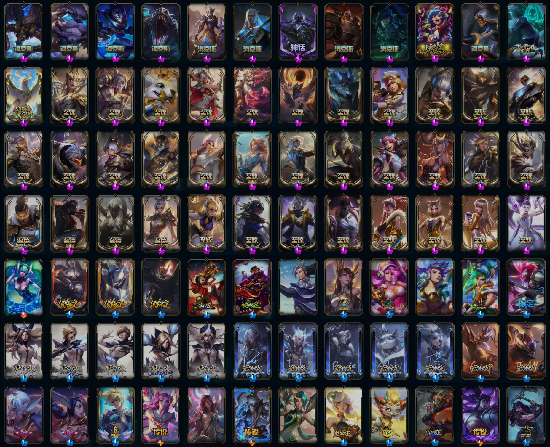 【传说皮肤】恶魔之刃泰达米尔 女校长菲奥娜 耀星女神拉克丝 源计划泯灭雷克顿 腥红之月鬼武姬阿卡丽 星之守护者卡莎 奥德赛凯隐 黎明使者索拉卡 泳池派对吉格斯 死亡骑士盖伦 烈焰雄心崔丝塔娜 鬼魂新娘莫甘娜 神拳李青 光明哨兵格雷福斯 律政大亨蒙多 电玩女神娑娜 西部魔影卢锡安 神龙尊者圣龙李青 炼狱魔犬内瑟斯 灵魂莲华锤石 欧米伽小队幽灵特工 陆地王者4WD布里茨 黯晶凤凰艾尼维亚 黯黑魔龙希瓦娜 魔幻卡牌崔斯特 女皇艾希 合金巨兽努努和威朗普 双重冰晶艾尼维亚 提莫约德尔人的一大步 屠龙勇士潘森 霸天零式赛恩 女主播迦娜 战地机甲厄加特 丧尸布兰德 钢铁军团盖伦 源计划净化薇恩 黎明使者锐雯 冰霜之刃艾瑞莉娅 红色男爵库奇 源计划林易 绅士科加斯 约德尔国队长提莫 邪鸦魅影乐芙兰 金牌主播德莱文 地狱行者孙悟空 暗星锤石 战地巨兽科加斯 枯萎之壤泽拉斯 地狱之门卫士加里奥 焰尾妖狐阿狸 最终BOSS维迦 第三类接触黑默丁格 苍穹之光韦鲁斯 战场女武神凯尔 符文战熊沃利贝尔 银河魔装机神兰博 黑夜使者亚索 灌篮高手德莱厄斯 苹果机器人布里茨 女警狙击凯特琳 源计划联合艾希 冰川巨兽墨菲特 驯龙炮手崔丝塔娜 铁哥们儿奥拉夫 蔷薇绅士杰斯 宇航员诺提勒斯 未来战士凯特琳 星之守护者金克丝 霸天异形卡兹克 大天使长米迦勒凯尔 血石领主弗拉基米尔