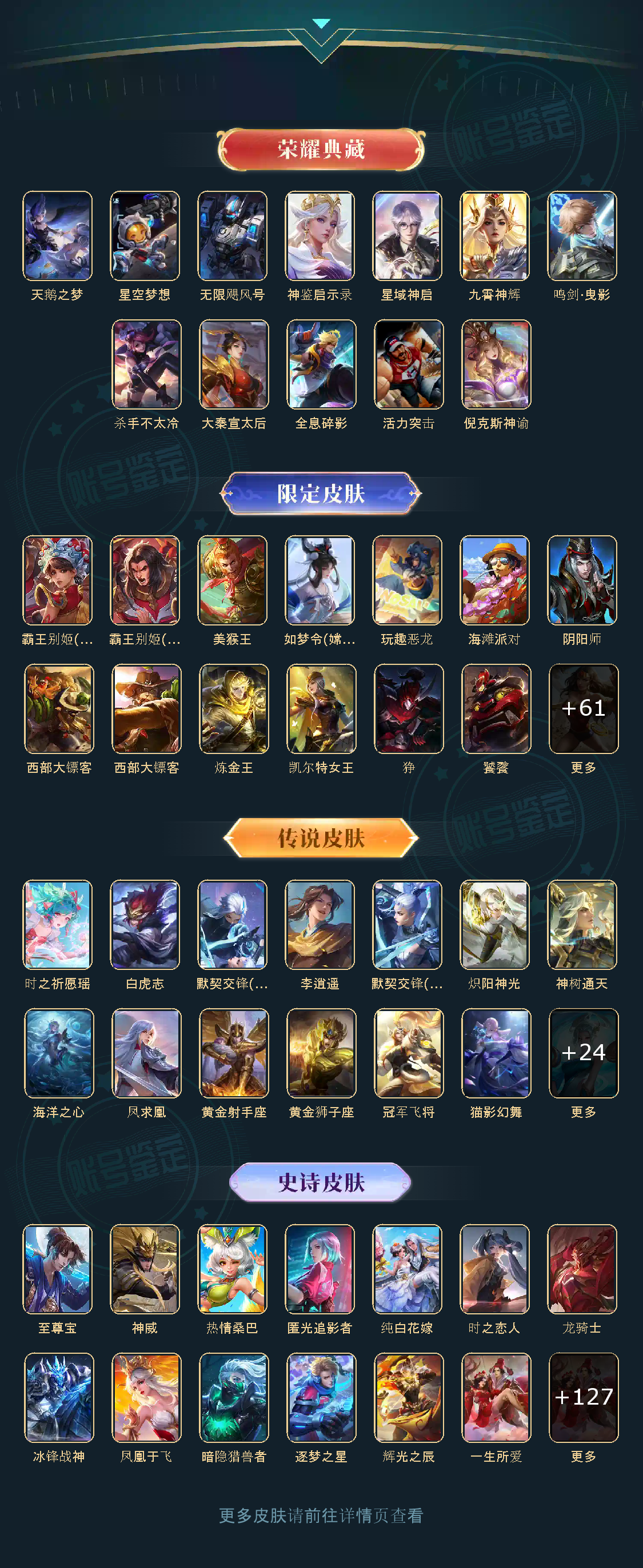 贵族等级V10,英雄数量122,典藏皮肤数11,皮肤数量414,冰锋战神/街头霸王/天鹅之梦/纯白花嫁/至尊宝/杀手不太冷/大秦宣太后/凤求凰/热情桑巴/神奇女侠/星空梦想/无限飓风号/黄金狮子座/一生所爱/全息碎影/大圣娶亲/冰霜恋舞曲/白虎志/朱雀志/活力突击/太华/久胜战神/飞衡/梁祝/倪克斯神谕/白鹤梁神女/匿光追影者/鸣剑·曳影/星域神启/李逍遥/武圣/奔雷神使/神威/淬星耀世/时雨天司