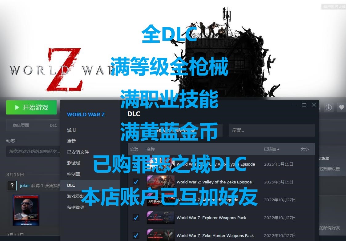 搜(鲸鱼)僵尸世界大战⭐全DLC⭐满等级全枪械⭐黄蓝金币满⭐满职业技能⭐本店已互加好友⭐已购罪恶之城