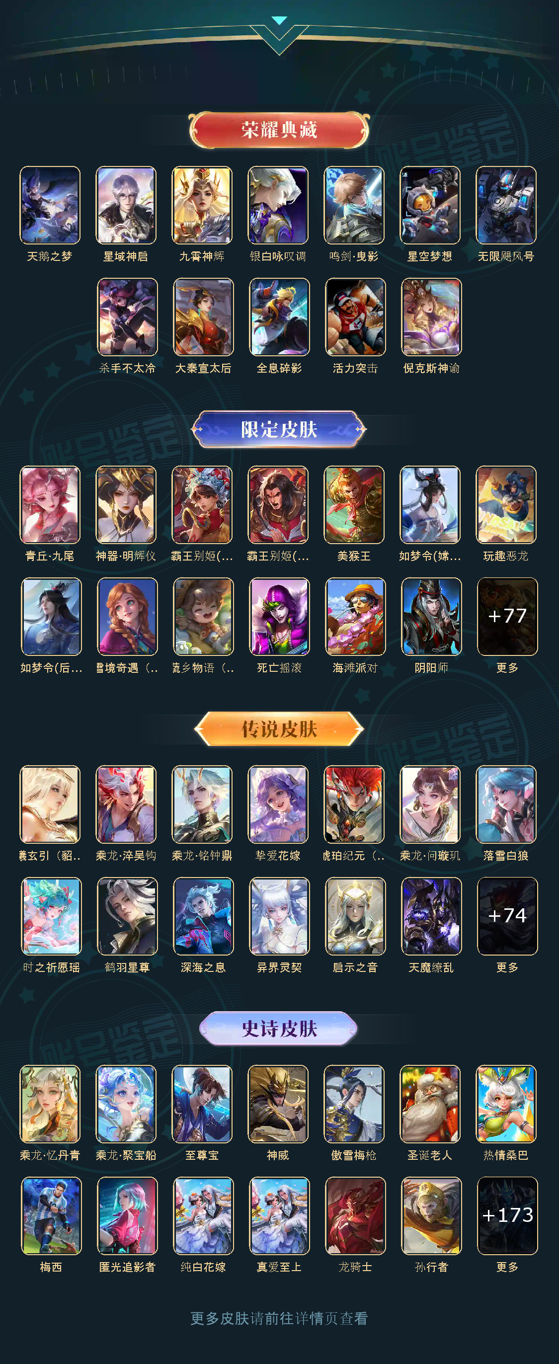 贵族等级,英雄数量125,典藏皮肤数11,皮肤数量548,天鹅之梦/杀手不太冷/星空梦想/无限飓风号/全息碎影/活力突击/倪克斯神谕/鸣剑·曳影/星域神启
