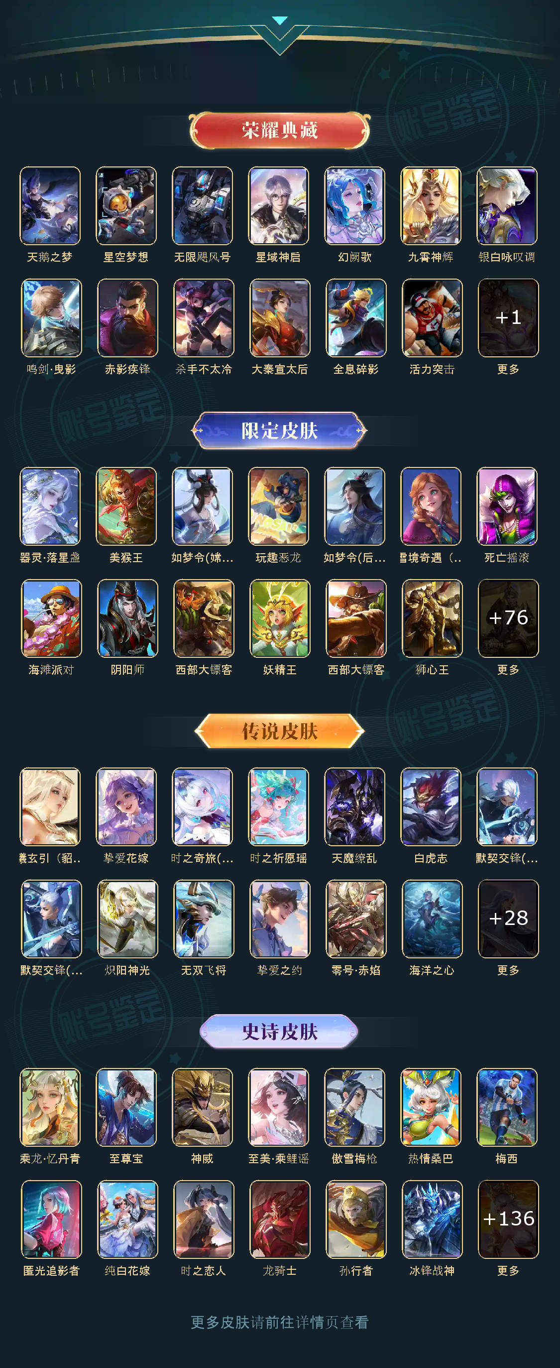 天鹅之梦,星空梦想,无限飓风号,鸣剑·曳影,赤影疾锋,星域神启,幻阙歌,九霄神辉,银白咏叹调,天魔缭乱,白虎志,默契交锋(兰陵王),默契交锋(花木兰),零号·赤焰,炽阳神光,热情桑巴,梅西,乘龙·忆丹青,至尊宝,神威,纯白花嫁,匿光追影者,时之奇旅(大乔),无双飞将,时之祈愿瑶,挚爱之约,挚爱花嫁,器灵·落星盏,至美·乘鲤谣,曦玄引(貂蝉),傲雪梅枪
