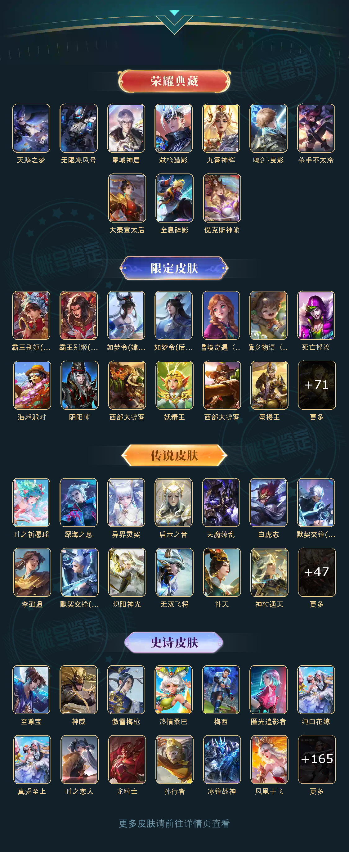 贵族等级V10,英雄数量125,典藏皮肤数10,皮肤数量511,九霄神辉/星域神启/鸣剑曳影/倪克斯神谕/无限飓风号/全息碎影